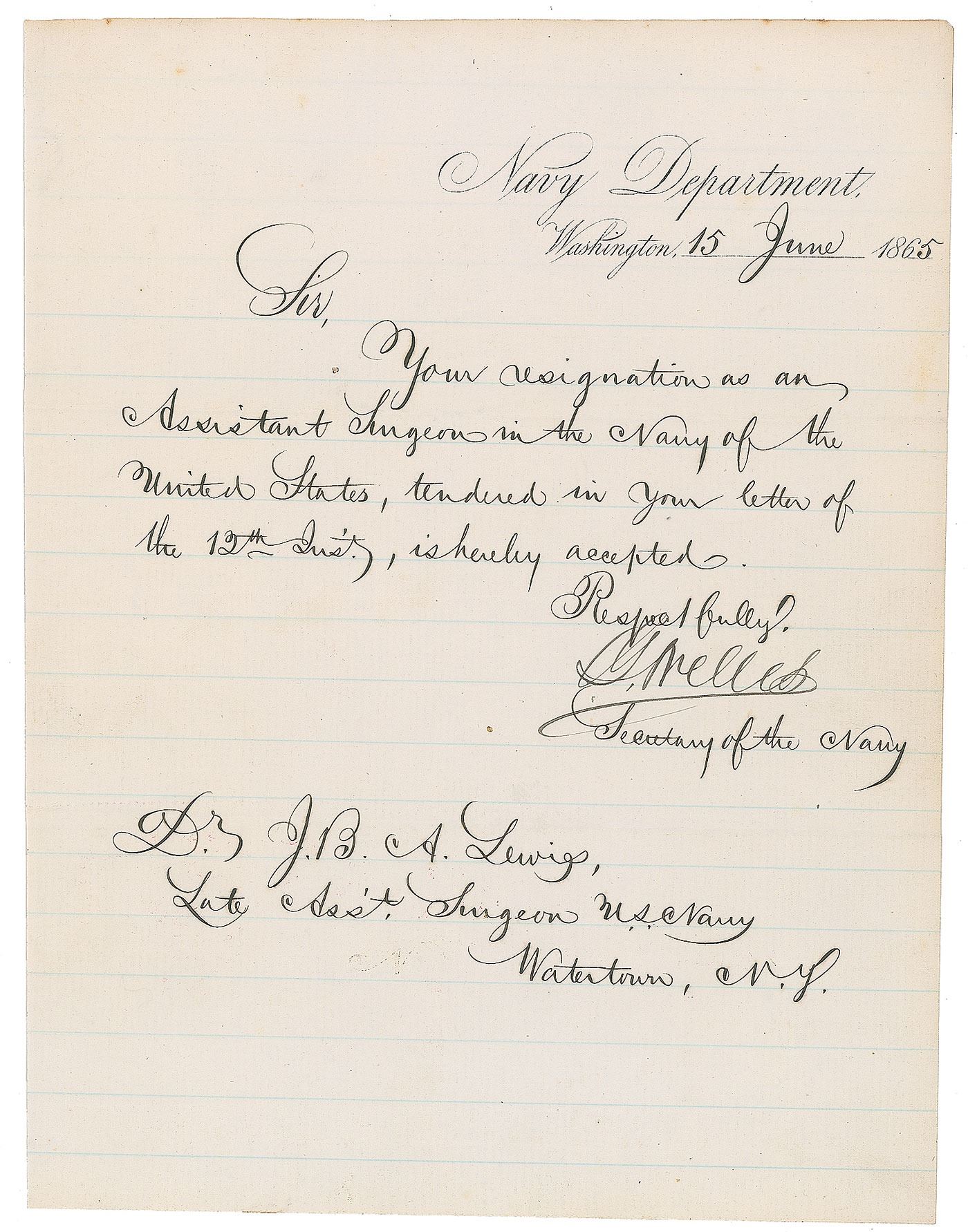 LS signed “G. Welles,” one page, 7.25 x 9.5, Navy Department letterhead, June 15, 1865. Letter to J. B. A. Lewis, "Late Ass't Surgeon U. S. Navy," in full: "Your resignation as an Assistant Surgeon in the Navy of the United States, tendered in your letter of the 13th Inst., is hereby accepted." In fine condition.