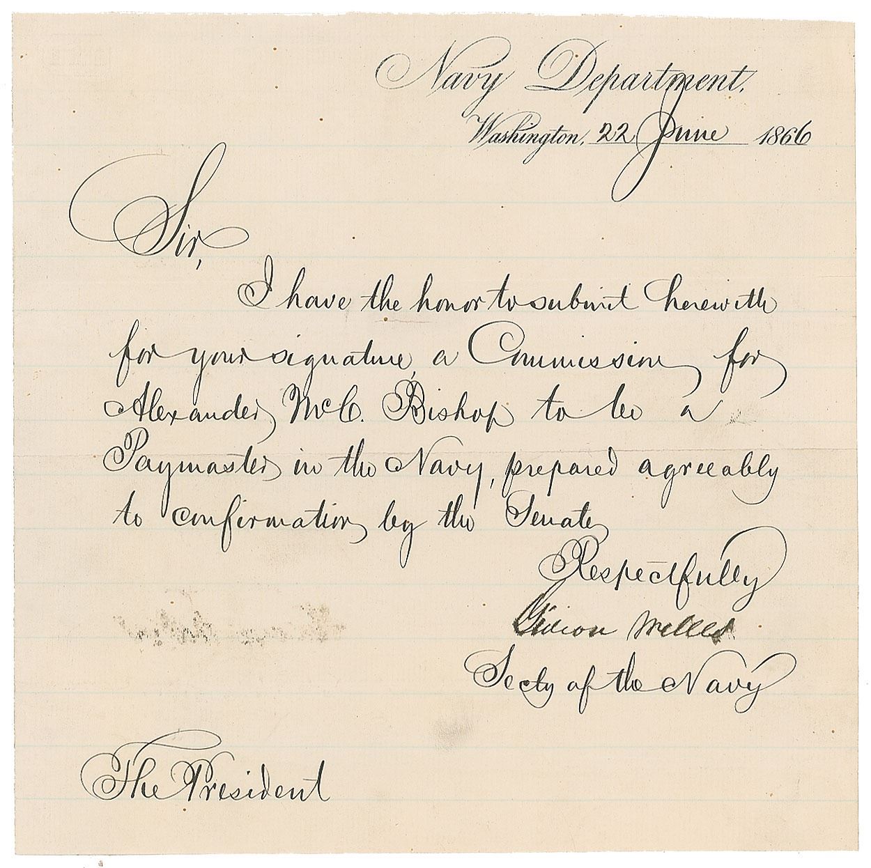 Manuscript DS, one page, 7.75 x 7.75, June 22, 1866. Official Navy Department letter addressed to President Andrew Johnson, in full: "I have the honor to submit herewith for your signature a Commission for Alexander McC. Bishop to be a Paymaster in the Navy, prepared agreeably to confirmation by the Senate." Signed at the conclusion by Gideon Welles as Secretary of the Navy. In fine condition, with trimmed edges.