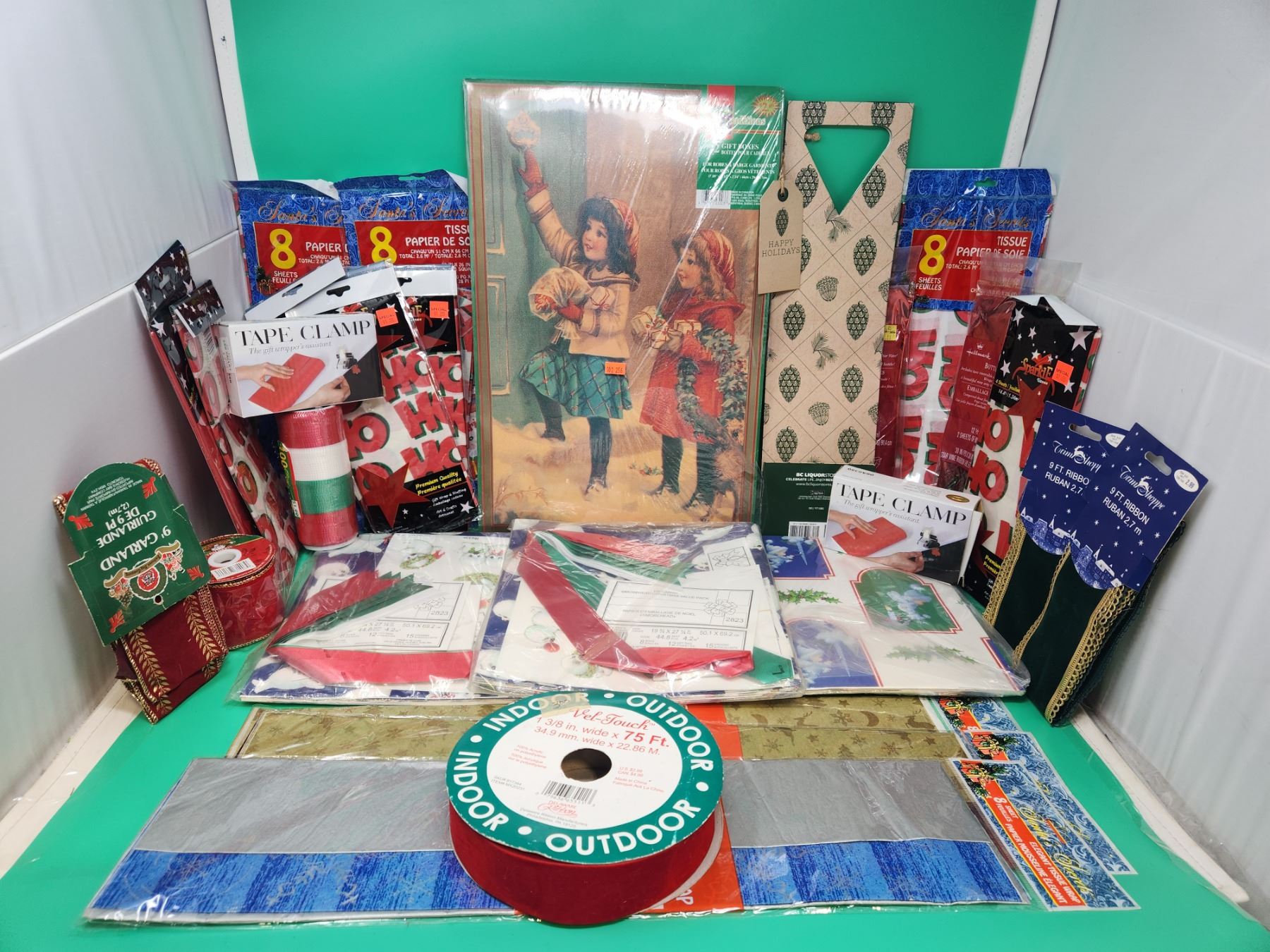 Gift Box & Wrapping Lot w/ Assorted Ribbon, Tape Clamps, Tissue Paper, & More
