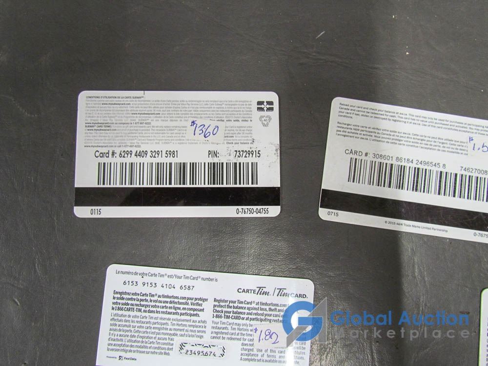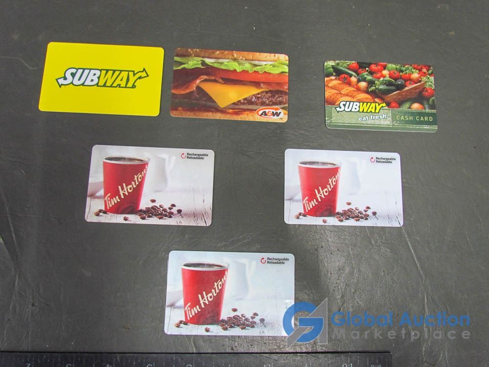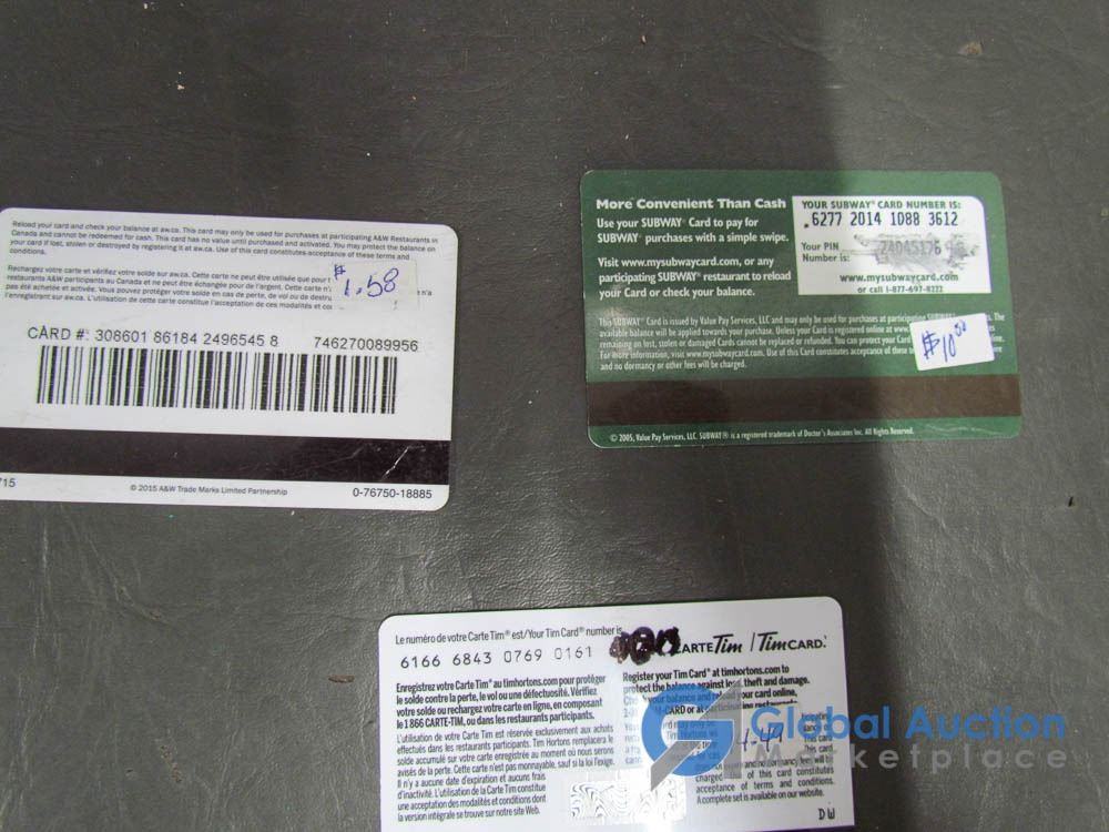 Gift Cards: Subway $23.60, A&W $1.58, Tim Hortons $18.98