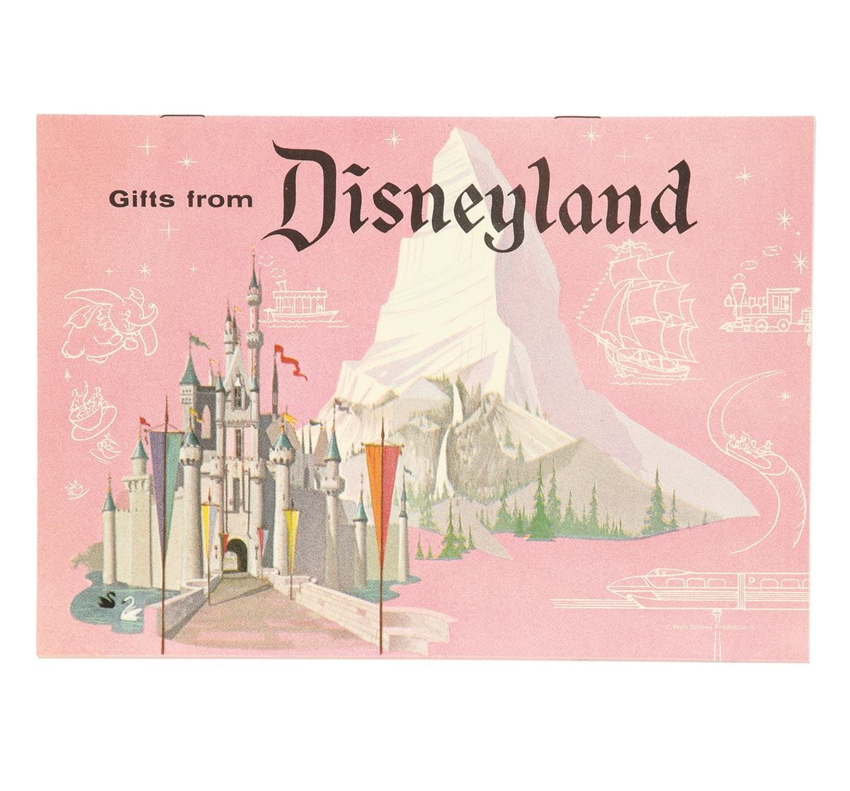 (Disneyland, 1960) A rare 1960 "Gifts from Disneyland" mail order catalog. Catalog offers such items as original animation cels delivered to your door for as little as $1.25. A fun and entertaining read featuring full-color photos of early Disneyland items. Measures 8.25"x6". 6 pages. In very good condition and comes with certificate from Disney Auctions.