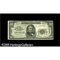 <B>Gig Harbor, WA</B></I> - $50 1929 Ty. 1 <B>The First NB</B></I> Ch. # 13057<BR>This is one of just four notes listed in the new census from this small only bank, and the only high denomination. It's likely the only one we'll ever see as well, as this bank issued just twenty sheets of fifties and no hundreds. <B>Very Fine.</B></I> Lot:17012
