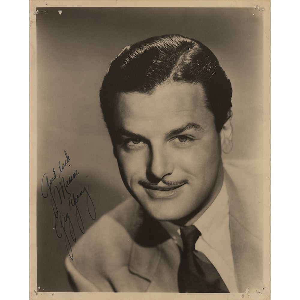 American actor (1913-1978) who won the 1969 Academy Award for Best Supporting Actor for his memorable role in They Shoot Horses, Don't They? Plagued by the 'Oscar curse' and increasingly acute alcoholism, Young killed himself and his fifth wife in a murder-suicide by gunshot just three weeks after their marriage. Handsome vintage matte-finish 8 x 10 photo of the troubled actor, signed and inscribed in fountain pen, "Good luck Maxine, Gig Young.” In very good to fine condition, with staple holes at the corners, easily matted out.