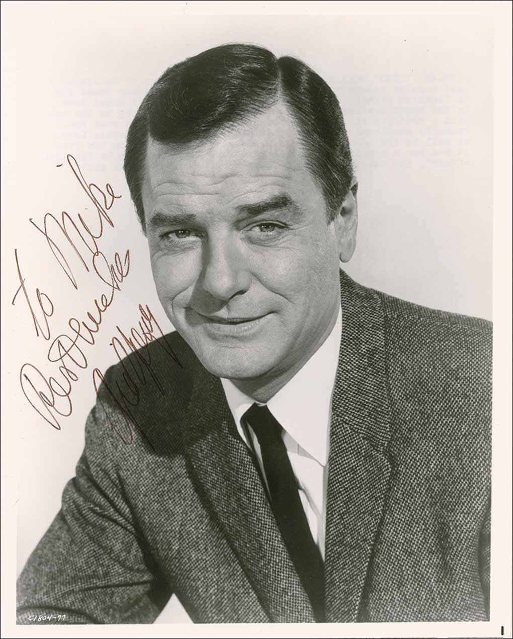 American actor (1913–1978) who won the 1969 Academy Award for Best Supporting Actor for his memorable role in They Shoot Horses, Don’t They? Plagued by the “Oscar curse” and increasingly acute alcoholism, Young killed himself and his fifth wife in a murder-suicide by gunshot just three weeks after their marriage. Vintage glossy 8 x 10 photo, signed and inscribed in brown ink “To Mike, Best wishes, Gig Young.” Scattered light surface marks and creases, and light show-through from printed caption on reverse, otherwise fine condition.