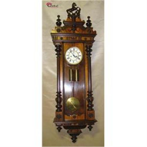 We are very excited to offer you this amazing two weights wall clock that dates from the last quarter of the 19th C. (c. 1880). This is the most wonderful two weights wall clock you will ever find! The clock is made of the finest walnut in two different colours and the patina is outstanding.This real beautiful museumpiece is an absolutely excellent wall clock and is in complete original and excellent condition.The clock contains a 8 day movement which is in fine working order. It is weight driven by two brass cylindrical shaped weights.The clock strikes every 30 minutes on an old gong .On the full hours it strikes the hours.The bronze clock work is signed on the back with:"Gustav Becker-Freiburg-Medaille d'Or-Number: 1336842" and is made by Gustav Becker the famous German clockmaker.The porcelain dial with the beautiful steel hands is provided with the monogram of Gustav Becker.Do not miss the opportunity to own this treasure!This clock is everywhere an absolutely eye catcher.This fantastic wall clock came out a very fine estate in the South of Germany near Munich. The dimensions are: Height: 55 Inches,Width: 18 Inches and Depth: 7 Inches.No matter where you hang this wall clock everyone will be begging to know where you got such an outstanding clock and where they can get one like it! Regarding shipping we will pack the clock in a wooden box so you will receive it in perfect condition.Shippingscosts to the U.S.A. are 220 US$. After payment you will receive the clock in about ...
