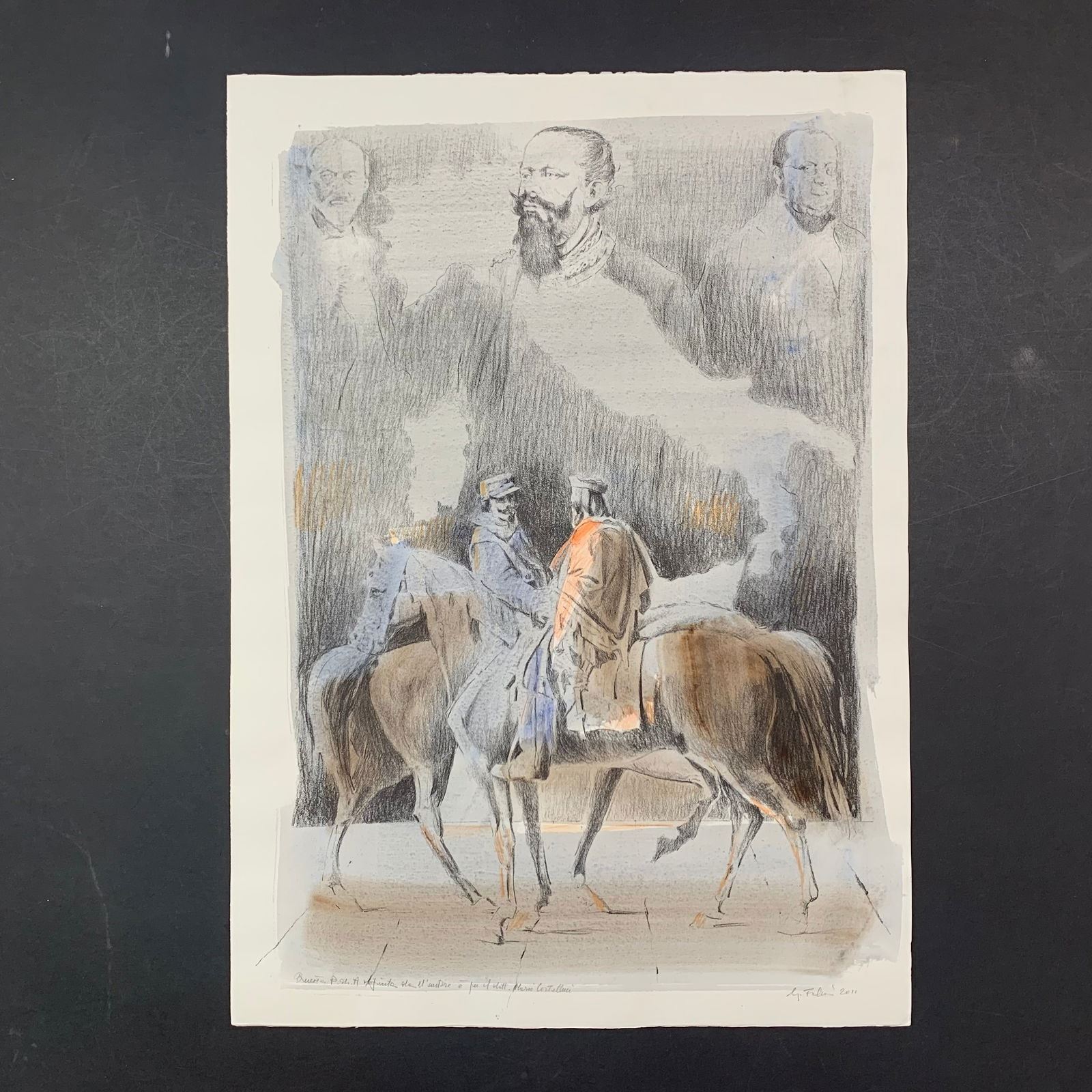 Gigino Falconi's "Incontro Garibaldi" original print, signed and dated lower right, and titled lower left. This piece is of two men on horses, with three heads in the background at the top. This piece is in near excellent condition with very minor dirt stain upper right, and a miniscule crease upper right corner.