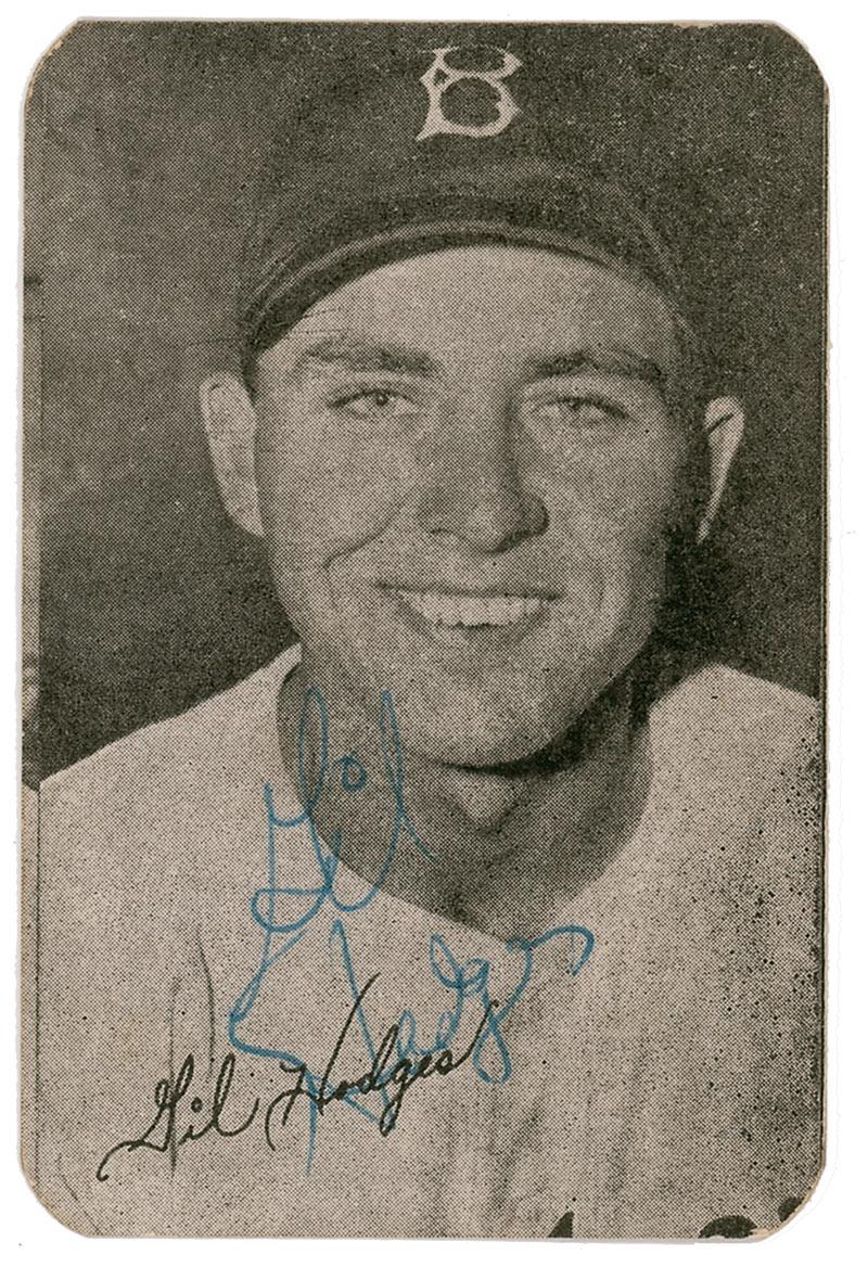 Longtime Dodgers player and manager (1924–1972) who later joined the Mets and managed the team in their stunning 1969 World Series victory. He died of a heart attack at the age of forty-seven. Vintage 2.25 x 3.5 cardstock photo of Hodges in his uniform, signed in blue ink. Photo also bears a pre-printed signature. In fine condition, with a bit of light contrast to signature.