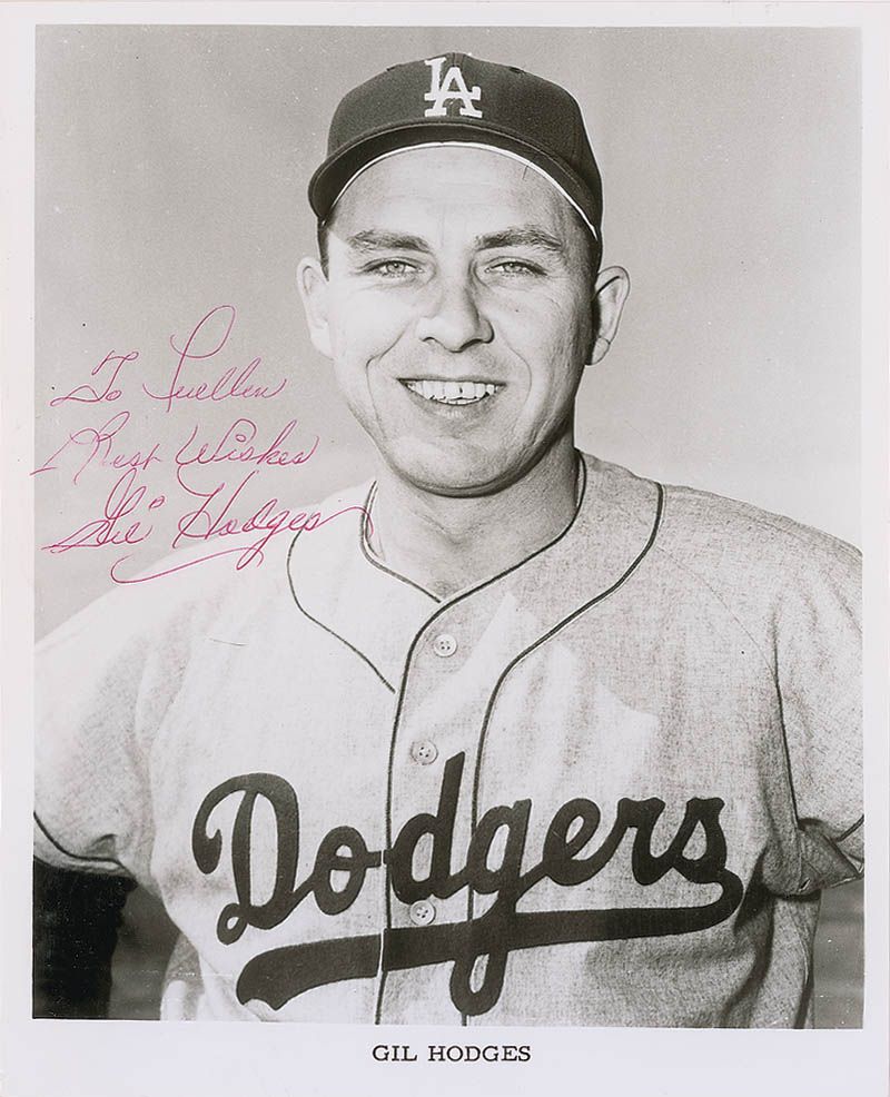 Glossy 8 x 10 photo of Hodges in his Dodgers uniform, signed and inscribed in red ballpoint “To Luellen, Best wishes, Gil Hodges.” In fine condition, with a couple mild creases and slight skipping to the sentiment. Accompanied by a full letter of authenticity from PSA/DNA.