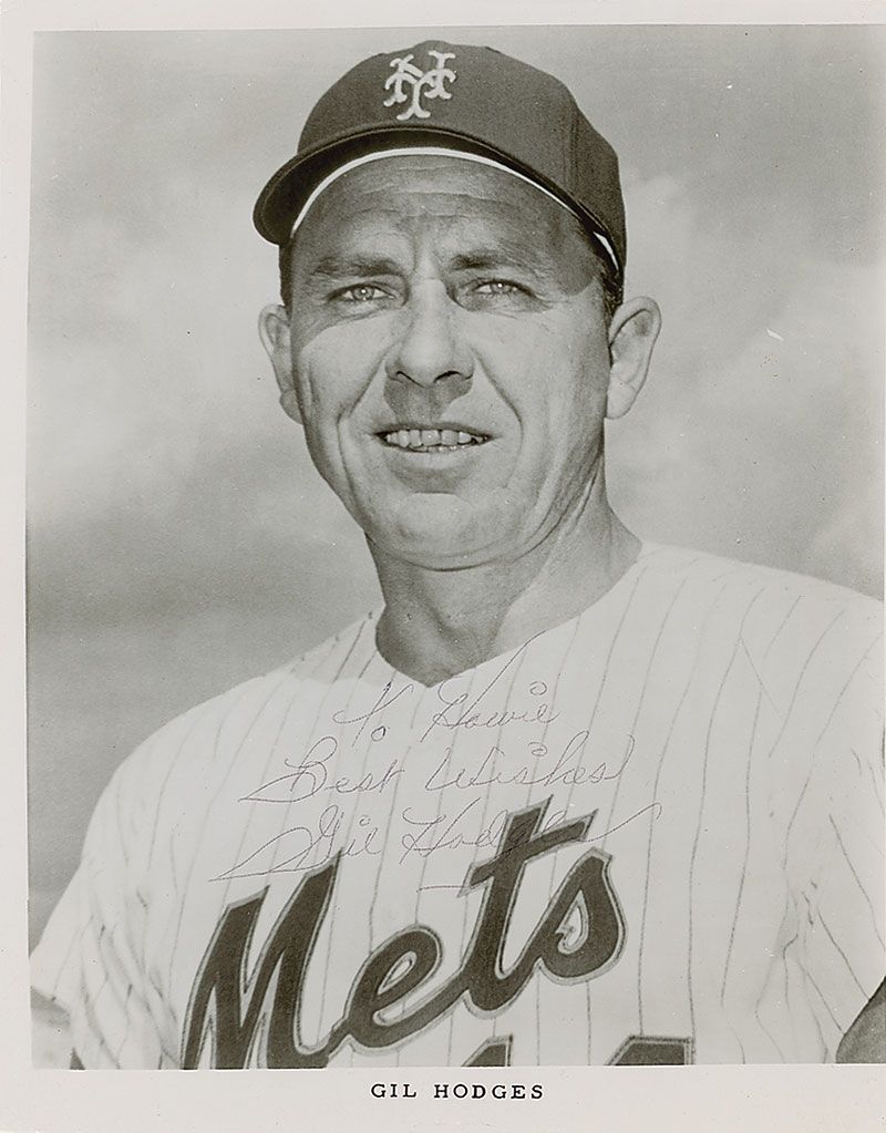 Longtime Dodgers player and manager (1924–1972) who later joined the Mets and managed the team in their stunning 1969 World Series victory. He died of a heart attack at the age of forty-seven. Vintage glossy 8 x 10 photo of Hodges in his Mets uniform, signed and inscribed in black ballpoint “To Howie, Best wishes, Gil Hodges.” In very good condition, with signature and inscription light, but still legible, due to decreased ink flow, and a trimmed right edge.