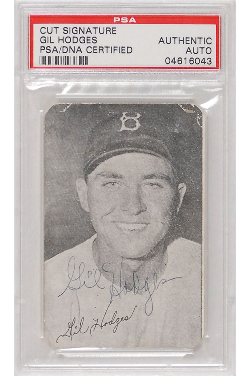 Scarce 1947 Homogenized Bond Bread Gil Hodges short-printed baseball card, 2.25 x 3.5, signed in fountain pen. Encapsulated in a plastic PSA/DNA authentication holder. Mounting remnants to upper corners, otherwise fine condition.