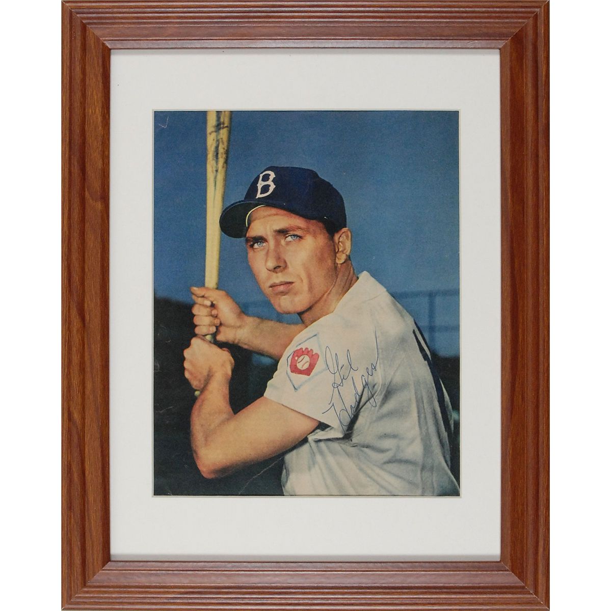 Scarce circa 1952 color 7.5 x 9.5 magazine photo of Hodges showing off his batting stance during his time with the Brooklyn Dodgers, nicely signed in blue ballpoint. Attractively matted and framed to an overall size of 12 x 15. Scattered surface creases and a few small tears, otherwise fine condition. Color photos from this era are quite uncommon.
