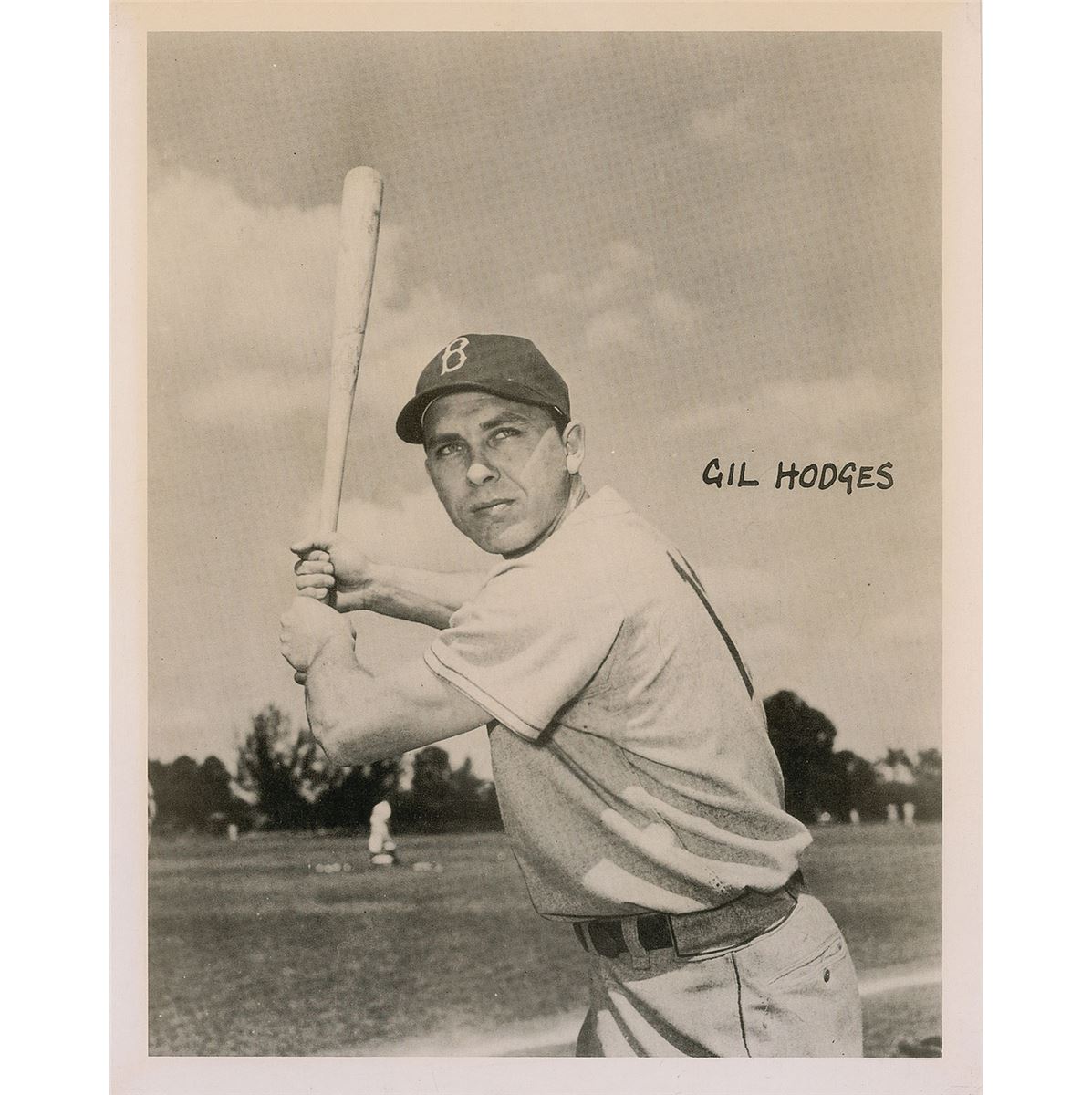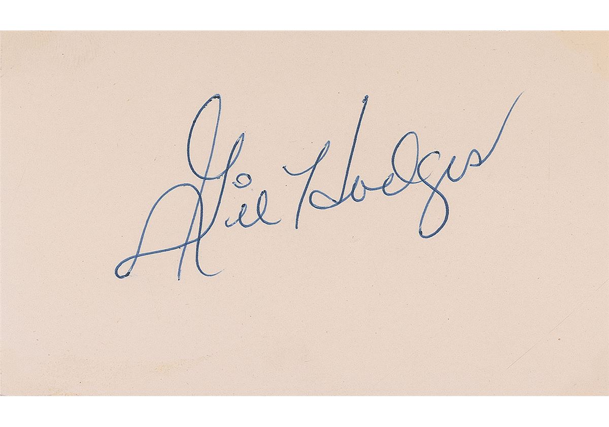 Ballpoint signature, “Gil Hodges,” on an off-white 5 x 3 card. In fine condition. Accompanied by an unsigned photo of Hodges in his batting stance.