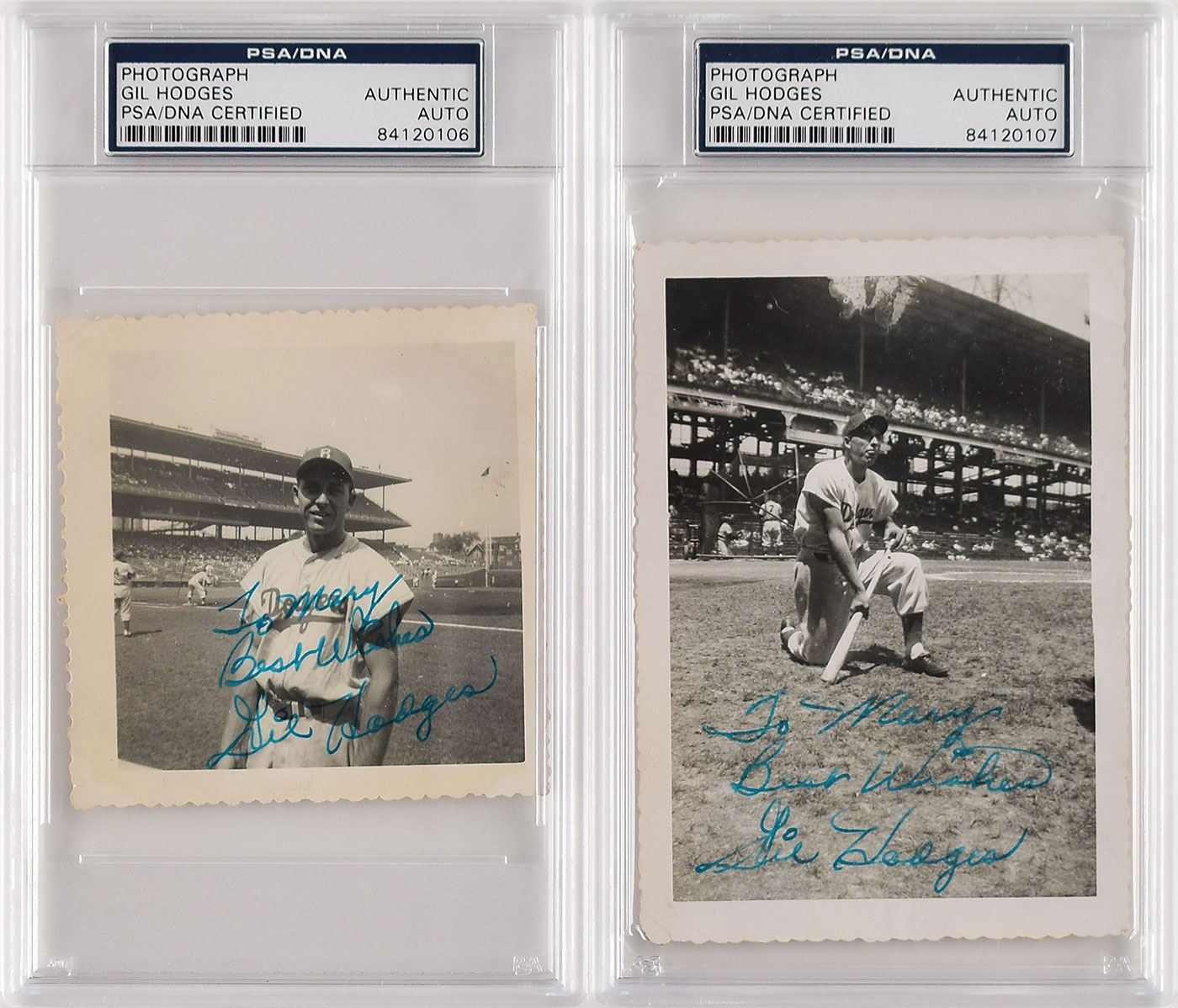 Two different original vintage glossy candid photos, 3.5 x 3.5 and 3.5 x 5, each signed and inscribed in fountain pen, "To Mary, Best Wishes, Gil Hodges." In overall fine condition. Both encapsulated in PSA/DNA authentication holders.