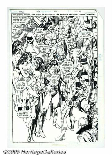 <B>Gil Kane - Action Comics #546, Splash Page 7 Original Art (DC, 1983).</B></I> Superman, Lois Lane, Hawkman, the Flash, Wonder Woman, Green Arrow, Zatanna, Firestorm, Red Tornado, the Atom, Raven, Cyborg, Starfire, Kid Flash, and Changeling highlight this meeting of the world's greatest super-heroes, from <B>Action Comics</B></I> #546. This page is taken from the story, "Showdown." Gil Kane is responsible for this blockbuster -- a veritable <I>tour de force</B></I> of pencil and ink by one of the most potent creative forces in comics history! The image area measures 10" x 25". The edges have been trimmed during the production process; otherwise the art is in Excellent condition.