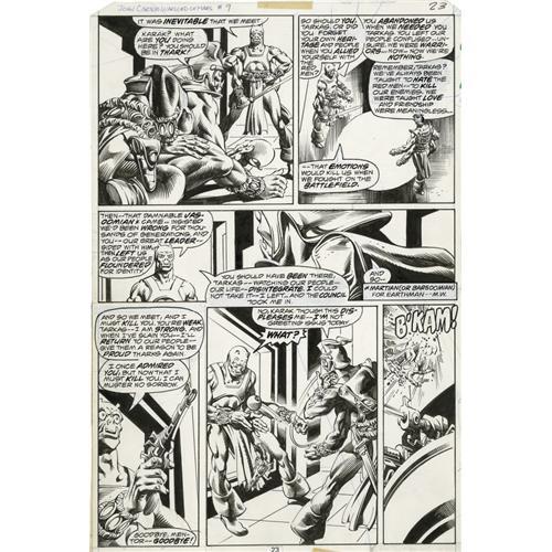 <B>Gil Kane and Rudy Nebres - John Carter Warlord of Mars #9, page 23 Original Art (Marvel, 1978).</B></I> Tars Tarkas takes center stage in this hard-hitting scene from "Armageddon... at Last!" Gil Kane obviously enjoyed working on John Carter, and Rudy Nebres gave Kane's pencils a polished finish. The image area of this page is approximately 10" x 15", and the art is in Excellent condition. <BR><BR><B>Important notice:</B> Heritage usually auctions material at the rate of 200-250 lots per hour. On some occasions eBay Live bid software or the Internet may not be able to keep up with the pace of the auction. We recommend placing a realistic absentee bid now as insurance to avoid disappointment. Occasionally the auctioneer may eliminate or reject an eBay Live bid, and the auctioneer may also reopen a lot after the close of the eBay live bidding (usually because we missed an audience bid), and may reject your bid even if it shows you as the winning bidder. By bidding via eBay Live, you agree that Heritage may award the lot to another bidder at its sole discretion under the circumstances described above or any other reasonable circumstances. Since eBay bids are not shown to us until we open the lot on the floor, we treat those bids just like floor bids. In most cases the floor responds before the eBay bid is presented to us, due to Internet lag time, so for consistency we have made it a policy that floor bids are always considered first over tie eBay live bids. Also please note that all Heritage lots purchased through eBay Live carry a 22.5% Buyer's Premium. Please make sure you read the Terms and Conditions before you bid. This lot is being auctioned in conjunction with a live floor auction by Heritage Auction Galleries. All final auction and invoice information will be supplied by Heritage Auction Galleries, and all other information should be considered preliminary. Lot:41001 <BR><BR><B>Winning Notification and Billing:</B> After the FINAL session in this auction is complete, Heritage will send e-mail and snail mail invoices. This process normally takes several days. All final auction and invoice information will be supplied by Heritage Auction Galleries, and all other information should be considered preliminary. <BR><BR>This auction will be conducted on a live auction floor and over the Internet through eBay Live. If you choose to place an absentee bid, please take a moment to <font color='#0000ff'><u><a href='http://pages.ebay.com/liveauctions/help/before/laabsentee.html'>learn how eBay Live absentee bidding works</a></u></font><font color='#000000'>