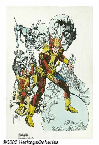 <B>Gil Kane - Star Hawks Hand Colored Paperback Cover Stat (Ace, circa 1980).</B></I> Gil Kane hand colored a large photostat of the Ace cover for the paperback which reprinted his 1976 science-fiction newspaper strip <I>Star Hawks</B></I>. A hand written note reads, "Original cover illustration for <I>Star Hawks</B></I> Ace paperback," and the piece was signed by Gil Kane. Mounted on foamcore board, the work has an overall size of 20" x 30", and aside from a few small stains, the piece is in Excellent condition.