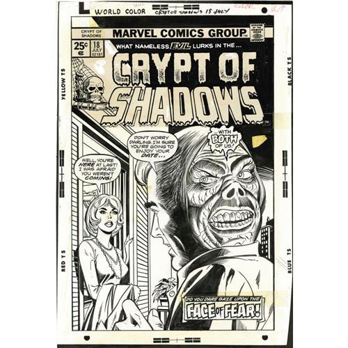 <B>Gil Kane (attributed) and Vince Colletta - Crypt of Shadows #18 Cover Original Art (Marvel, 1975).</B></I> Do you dare gaze upon the face of fear? This terrifying cover from the glory days of the Bronze Age has an image area of 10.5" x 15". Aside from some discoloration in the original photostat logo and indicia art, and some slight glue staining, the condition is Very Good.
