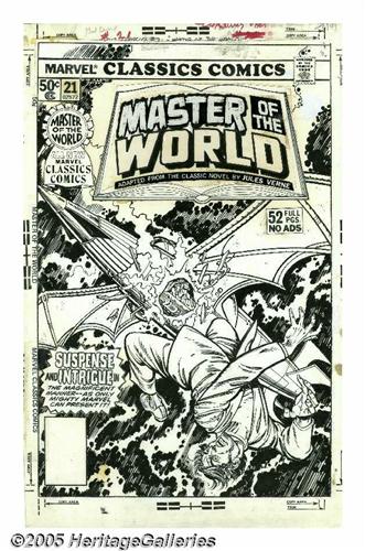 <B>Gil Kane and Bob Wiacek - Marvel Classic Comics #21 Cover Original Art (Marvel, 1977).</B></I> Penciler Gil Kane and inker Bob Wiacek deliver suspense and intrigue in the magnificent Marvel manner, on this cover illustration for the adaptation of Jules Verne's <B>Master of the World</B></I>. The image area measures 10" x 15" and, aside from some very light stains, the art is in Very Good condition.