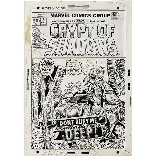 <B>Gil Kane and Ernie Chan - Crypt of Shadows #6 Cover Original Art (Marvel, 1973).</B></I> Penciler Gil Kane and inker Ernie Chan grabbed the Marvel fans by the throat with this Bronze Age chiller from the early seventies. The drama of the "cover hook" is heightened by the funereal setting of this macabre masterpiece. This superb cover has an image area that measures 10" x 15". There are a few small glue stains; otherwise, the art is in Very Good condition. A copy of the comic book is included in this pulse-pounding lot. <BR><BR><B>Important notice:</B> Heritage usually auctions material at the rate of 200-250 lots per hour. On some occasions eBay Live bid software or the Internet may not be able to keep up with the pace of the auction. We recommend placing a realistic absentee bid now as insurance to avoid disappointment. Occasionally the auctioneer may eliminate or reject an eBay Live bid, and the auctioneer may also reopen a lot after the close of the eBay live bidding (usually because we missed an audience bid), and may reject your bid even if it shows you as the winning bidder. By bidding via eBay Live, you agree that Heritage may award the lot to another bidder at its sole discretion under the circumstances described above or any other reasonable circumstances. Since eBay bids are not shown to us until we open the lot on the floor, we treat those bids just like floor bids. In most cases the floor responds before the eBay bid is presented to us, due to Internet lag time, so for consistency we have made it a policy that floor bids are always considered first over tie eBay live bids. Also please note that all Heritage lots purchased through eBay Live carry a 22.5% Buyer's Premium. Please make sure you read the Terms and Conditions before you bid. This lot is being auctioned in conjunction with a live floor auction by Heritage Auction Galleries. All final auction and invoice information will be supplied by Heritage Auction Galleries, and all other information should be considered preliminary. Lot:41001 <BR><BR><B>Winning Notification and Billing:</B> After the FINAL session in this auction is complete, Heritage will send e-mail and snail mail invoices. This process normally takes several days. All final auction and invoice information will be supplied by Heritage Auction Galleries, and all other information should be considered preliminary. <BR><BR>This auction will be conducted on a live auction floor and over the Internet through eBay Live. If you choose to place an absentee bid, please take a moment to <font color='#0000ff'><u><a href='http://pages.ebay.com/liveauctions/help/before/laabsentee.html'>learn how eBay Live absentee bidding works</a></u></font><font color='#000000'>