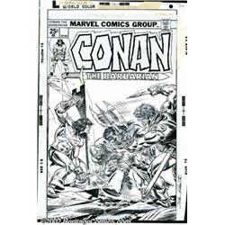 Gil Kane and John Romita - Original Cover Art for Conan the Barbarian #53 (Marvel, 1975). Not one, but two of comics greatest artists team up to create this cover for Conan the Barbarian. Gil Kane pencils and John Romita inks this masterpiece of Bronze Age art. Loaded with great expressions and lots of detail, this cover is packed with power and demonstrates what happens when two master artists work together to take a work to the next level. Some white-out and reworking of Conan's torso, and white-out along the bottom edge don't diminish from this piece's overall magnificence. Signed by John Romita along the right edge. 11" x 17". Important notice: We expect to be auctioning lots at the rate of 200-250 per hour. Sometimes eBay Premier live bid software cannot keep up with that pace, so we strongly recommend that you place a realistic proxy bid now as insurance to avoid disappointment. Also please note that all Heritage/CAA lots purchased through eBay Premier carry a 20% Buyer's Premium. Please make sure you read the Terms and Conditions.