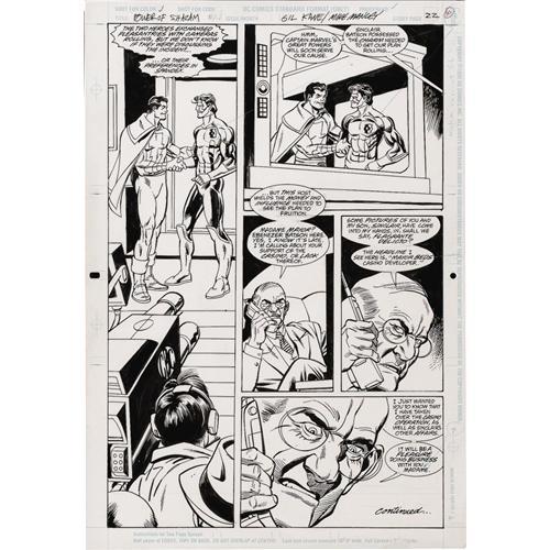 <B>Gil Kane and Mike Manley - The Power of Shazam #14, page 22 Original Art (DC, 1996).</B></I> Green Lantern and Captain Marvel shake hands as they wrap up an adventure in this terrific page penciled by comic book mainstay Gil Kane. Mike Manley provides the silky-smooth inks. This page has an image area of 13" x 18", and the art is in Excellent condition.