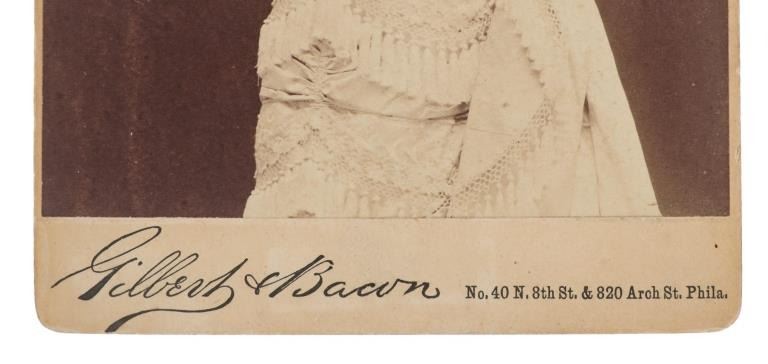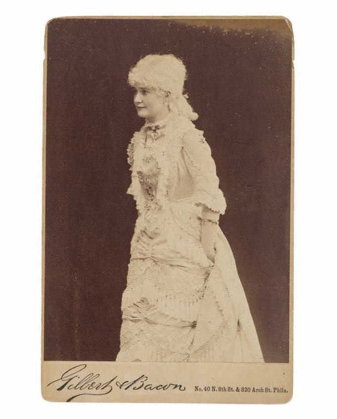 Featured in this lot is this Gilbert & Bacon "Lotta Crabtree" cabinet card circa 19th century; Provenance: From the Tombstone Western Heritage Museum in Tombstone, Arizona. This cabinet card features a wonderfully and professionally crafted construction that shows the actress Lotta Crabtree posing in a fancy dress and her hair done up. The cabinet card is marked as follows: Gilbert & Bacon - No. 40 N. 8th St. & 820 Arch St. Phila. Charlotte Mignon "Lotta" Crabtree (November 7, 1847 – September 25, 1924), also known mononymously as Lotta, was an American actress, entertainer, comedian, and philanthropist. Born in New York City and raised in the gold mining hills of Northern California, she rose to fame as a child performer. Crabtree became one of the wealthiest and most beloved American entertainers of the late 19th century. From her beginnings as a 6-year-old until her retirement at age 45, she entertained and was named "The Nation's Darling". Her life story was filmed as Golden Girl (1951), starring Mitzi Gaynor. The condition of this Gilbert & Bacon cabinet card is well preserved with some wear to the top right hand corner and shows some browning to the cabinet card due to age but otherwise shows a well preserved condition. The measurements of this cabinet card is 6 1/2" x 4 1/4". P220. Previously valued at $2,500.
