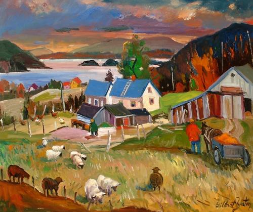 Born 1939 <BR> Sheep Farm, St. Fortunat <BR> Oil on board <BR> Signed; signed & titled on reverse <BR> 20 x 24in., 50.8 x 61cm. <BR>