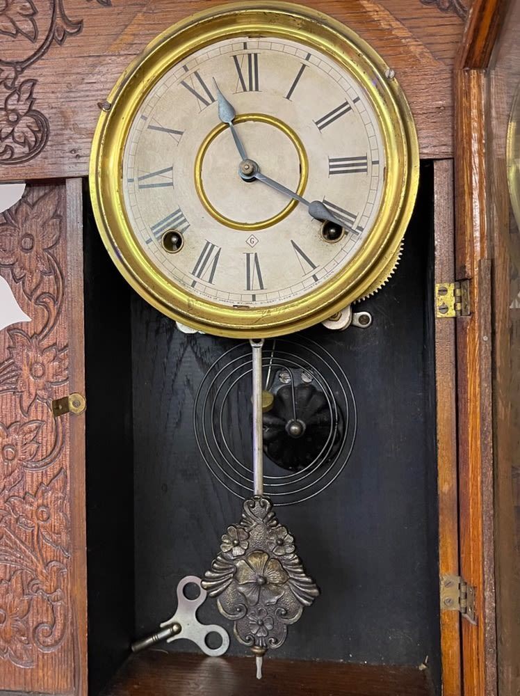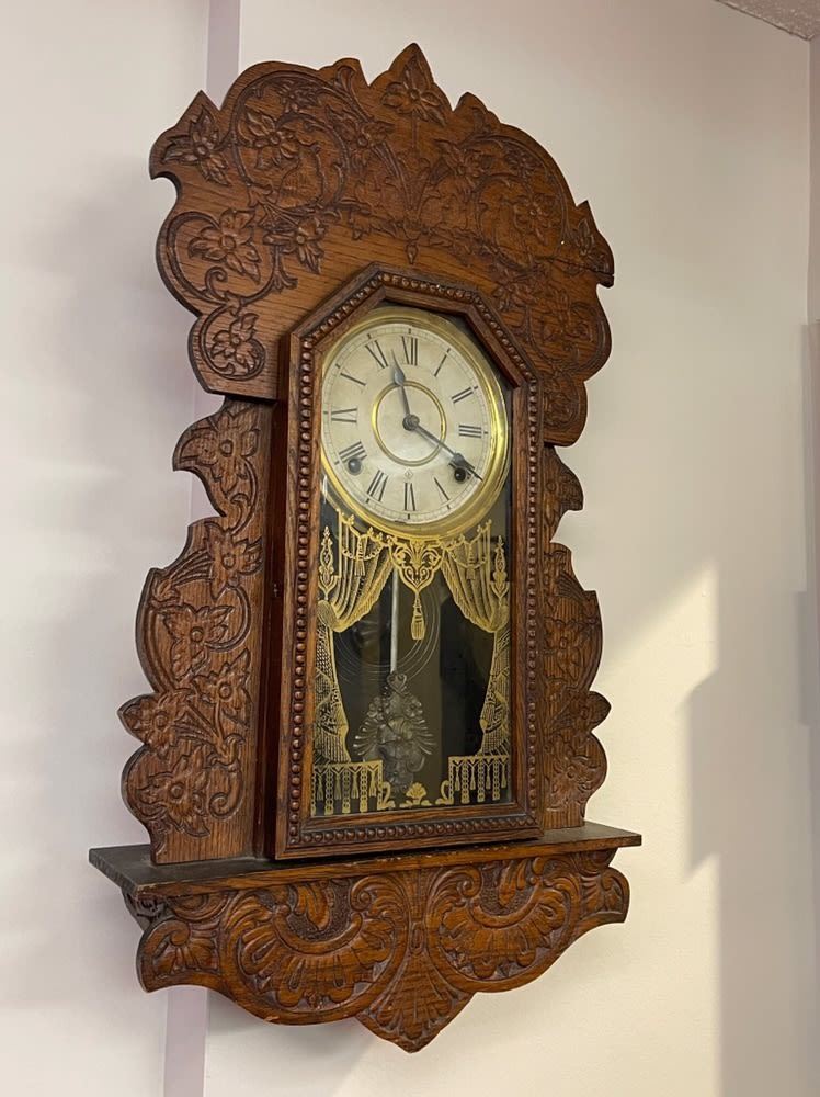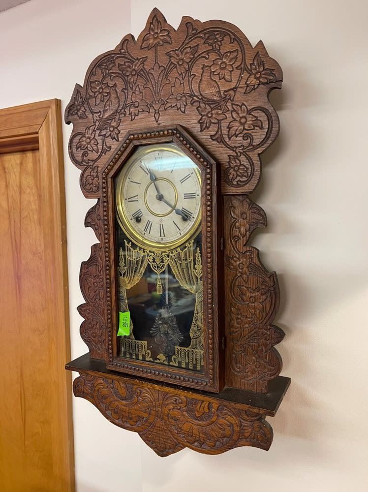Wm. L. Gilbert, Winsted Conn. Porto Rico Gingerbread oak wall hanging clock. In running conditions with unusual carved birds, original paper label on back, beautiful gold gilt glass, key and pendulum.