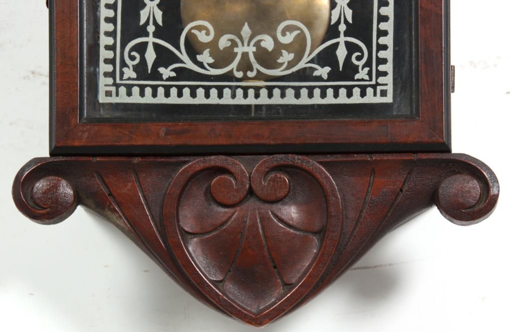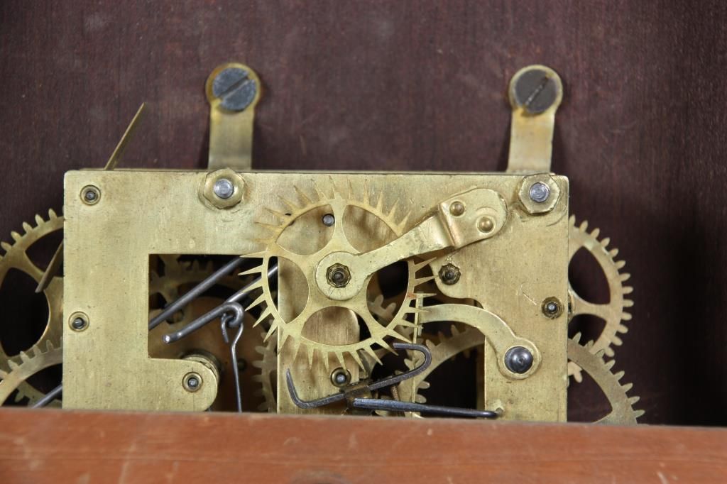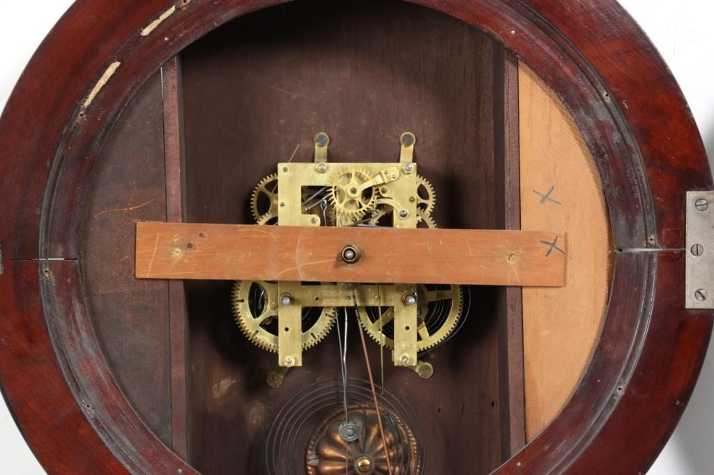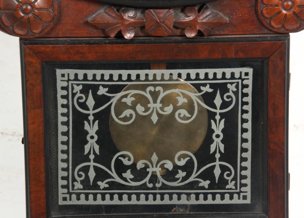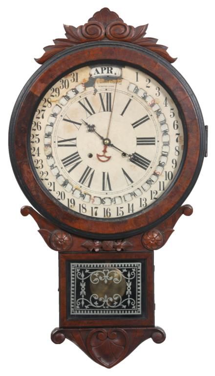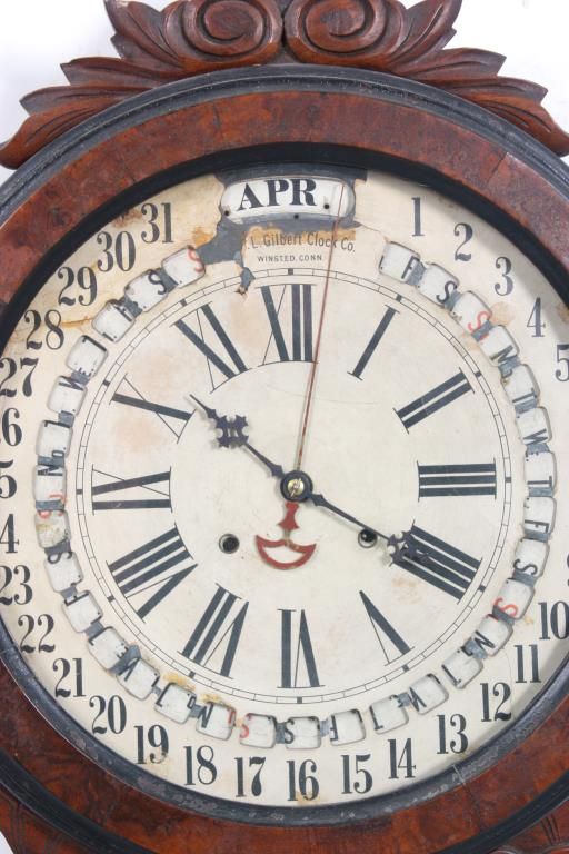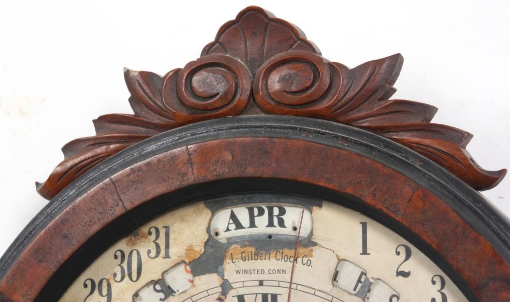 Gilbert Maranville Office Drop Calendar Clock. Large sized 14 in. paper dial, comprised of 3 discs, the front disc contains the chapter ring with black Roman hour numerals and outer ring with 31 date calendar signed Wm. L. Gilbert Clock Co. Winsted, Ct. has cutouts for the second disc containing the sequential days of the week with Sunday highlighted in red and finally a cutout at the top exposing the months; the red date indicator moves automatically while the clock is running and the rear dials are manually adjusted at each months end, dials have some typical wear from age. Has a brass 8 day movement with recoil escapement, hour strike on a coiled gong, brass covered pendulum bob and wood stick. In a walnut case having a crest with fancy scroll carvings, leaf, rosette and cornucopia carving below, reverse painted lower door glass and lower crest with sea shell carving. In original finish and good running condition, dial has some roughness to the paper. 34 in. high