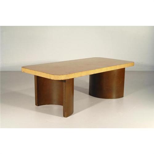 15.5h x 44w x 22d inches, bleached mahogany, brown leather covered legs with iron buttons, original vintage condition with a small drawer at the end