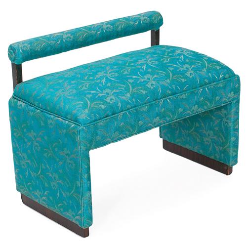Gilbert Rohde bench, attribution, upholstered seat and sides with rolled back cushion, supports and base of rosewood veneer, reupholstered, unmarked, 30.75"w x 18.25"d x 23.75"h, chip to one leg, good condition