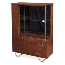 Gilbert Rohde china cabinet, by Herman Miller, Formal Group No. 3321, c.1940, walnut and burled walnut case, glass door with original knob over chromed bases, blue mirror glass to back wall and one glass shelf with chrome ball supports, drop-front door at bottom, original finish, 36”w x 14”d x 52”h, very good condition