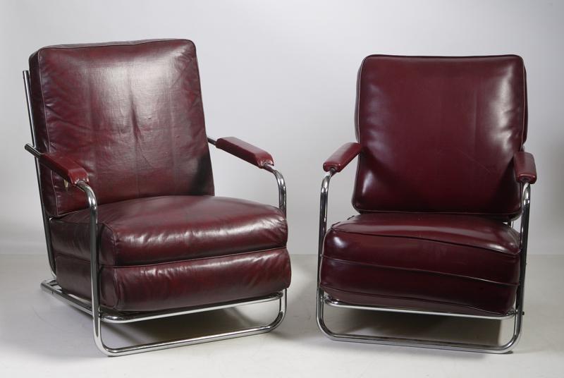 Circa 1930's, slant back chrome frames with leather upholstered backs, seats, and arm rests, each chair measures 32"H x 24"W x 33"D. One chair has a 4" slice on the back side of the back cushion and the other chair's seat and back have been replaced and are not original and there is surface dirt throughout each chair.
