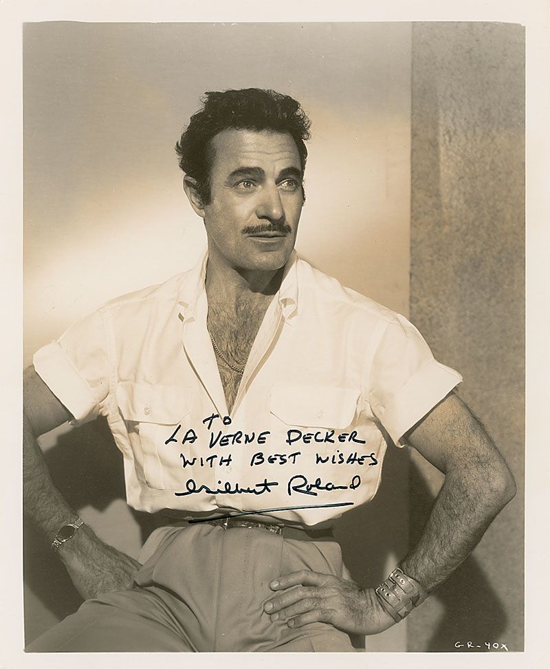 Glossy 8 x 10 photo of the hirsute actor with an unbuttoned shirt, signed and inscribed in black felt tip, “To LaVerne Decker, With Best Wishes, Gilbert Roland.” In fine condition, trivial creasing to the lower left corner.