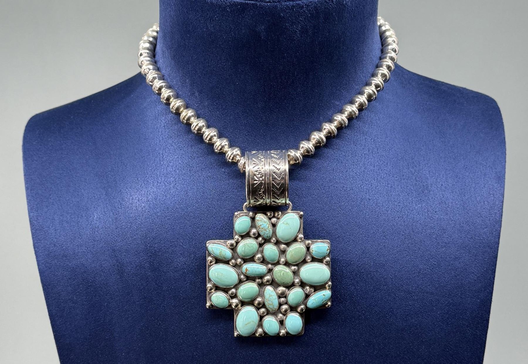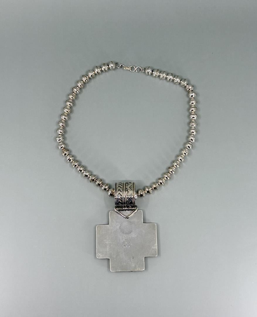 Cross set with Turquoise, on a Navajo Silver Pearl Necklace. 10 1/4" long closed. 86.1 grams.
