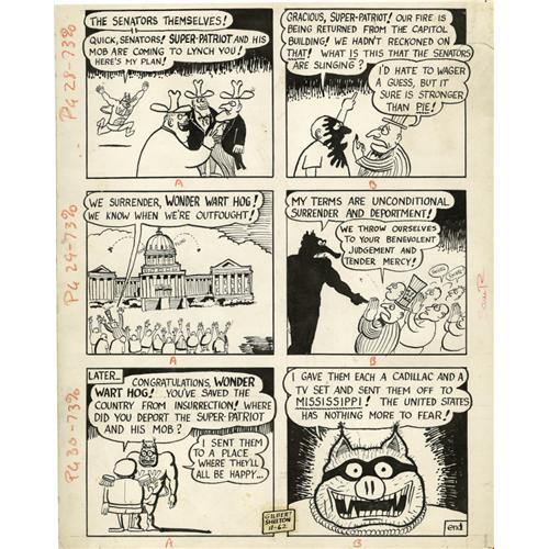 <B>Gilbert Shelton - "Wonder Wart-Hog Meets Super Patriot" Page Original Art (1962).</B></I> Underground Comix great Gilbert Shelton began his career by contributing comic strips to his college paper, University of Texas' <B>Texas Ranger</B></I>, back in 1961. His savagely funny parody of superheroes, "Wonder Wart-Hog," was a big hit with the college crowd, and before long, Shelton's fang-toothed crime fighter was appearing in <B>Help!</B></I> and <B>Cycle Toons</B></I> magazines. This is the last page from a story originally found in <B>Texas Ranger</B></I>; it was later reprinted in the 1967 Fawcett Gold Medal paperback book <B>Wonder Wart-Hog, Captain Crud and Other Super Stuff</B></I>, a collection of college comic strips that also included the work of Vaughan Bode, and helped usher in the Age of the Undergrounds. The red notations in the margins were for the <B>Captain Crud</B></I> book, which broke the story up into two-panel pages (this piece made up pages 28, 29, and 30). The art is in pen-and-ink on sketchpad paper, and is in Very Good condition with some minor soiling and small tears, none of which adversely affect the image area; a small paste-up over Shelton's original signature has since dropped off. A rare classic!