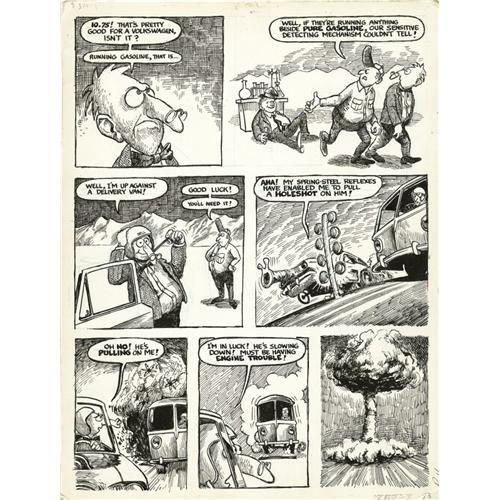 <B>Gilbert Shelton - Wonder Warthog Panel Page Original Art (mid 1960s).</B></I> Gilbert Shelton may be best known for his <B>Fabulous Furry Freak Brothers</B></I> comics, which have been endlessly reprinted. Those books can still be found in "head shops" today (if one can actually <I>find</B></I> a head shop), alongside rolling papers and plastic "bongs". Lesser known is his wonderfully witty send-up of superhero comics starring Wonder Warthog, which at one time could be seen in such diverse publications as <B>CARtoons</B></I> and Harvey Kurtzman's <B>Help!</B></I>. This sharply-rendered page features Warthog's secret identity, Philbert Desanex (that's him with the long nose and round glasses), in what looks to be a page from <B>CARtoons</B></I>. The ink and blue pencil on illustration board page measures approximately 11" x 14, and is in Very Good condition.