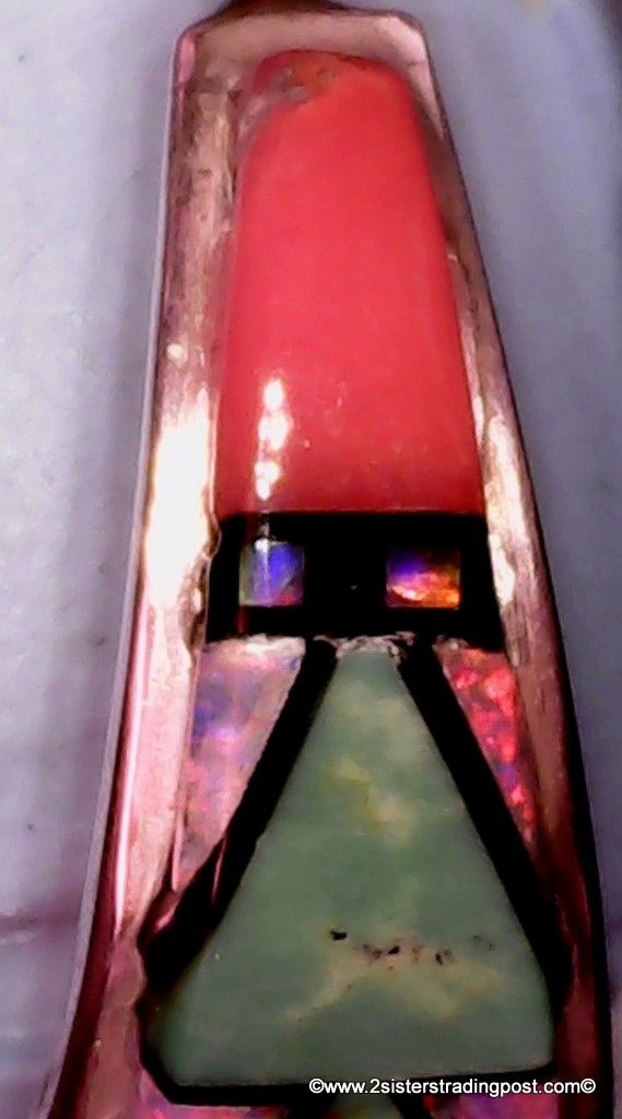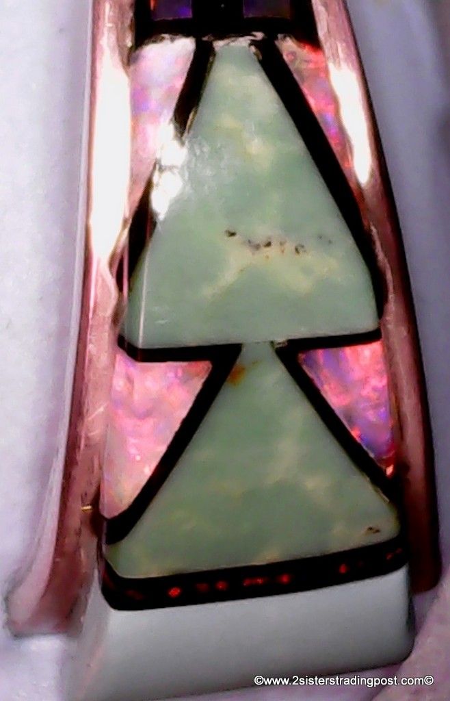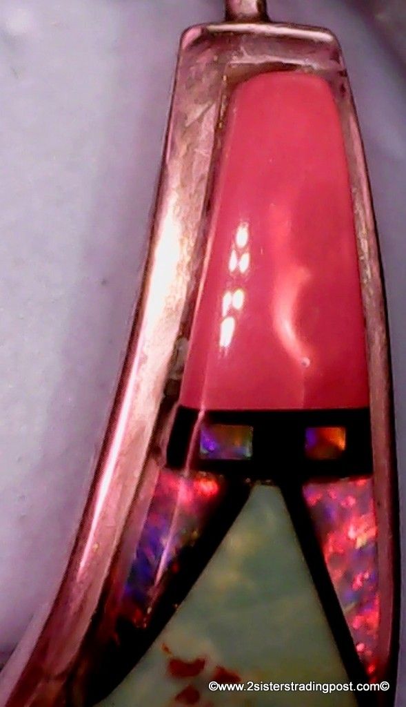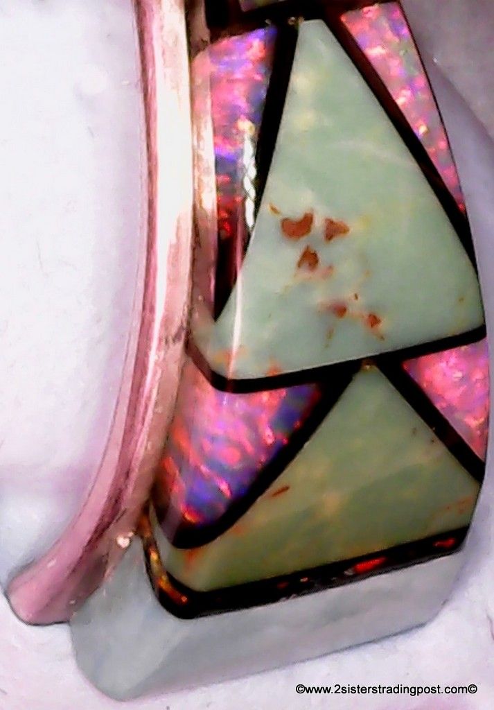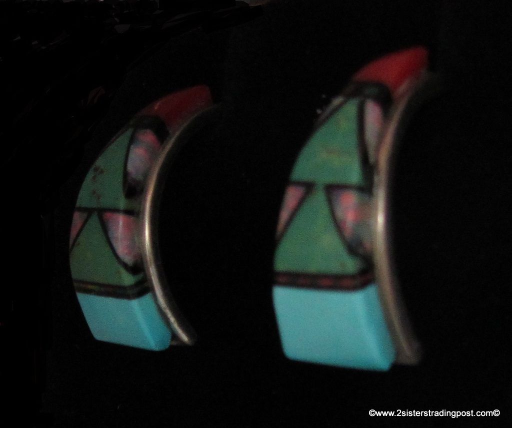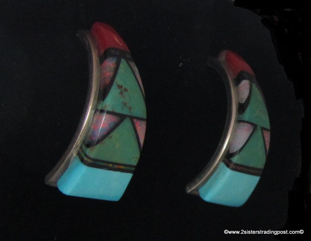 Navajo silversmith Gilbert Tom created this beautiful triangle shape 1/4 hoop earring with a simple sterling back topped with a turquoise, coral, Opal, jet and/or onyx inlay. Hoop height is approximately 23 mm, triangle is approximately 4 mm at top and 10 mm at the bottom, earrings weigh approximately 2.5 g each, making a total combined weight of 5 g. Both earrings are stamped Gilbert Tom, sterling.
