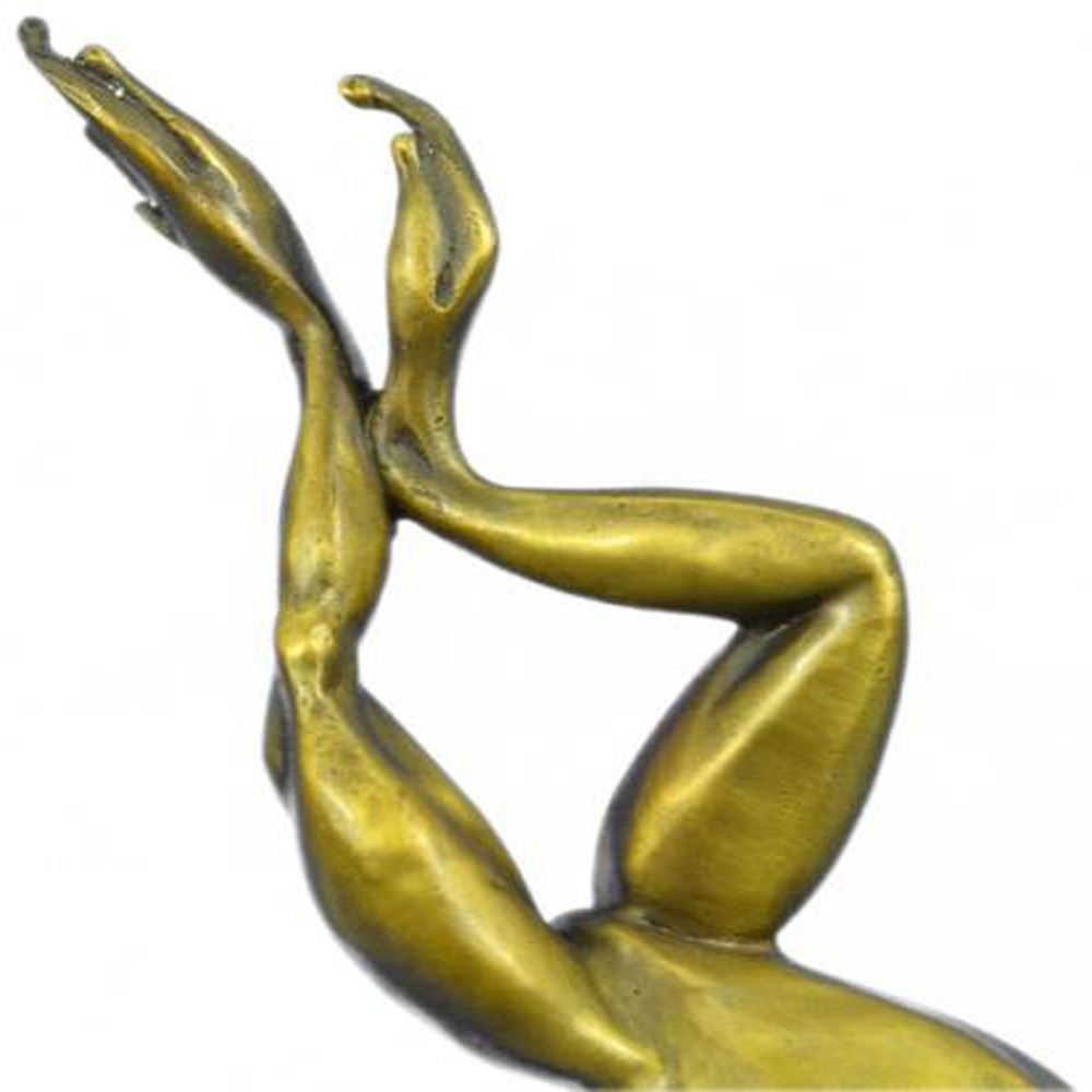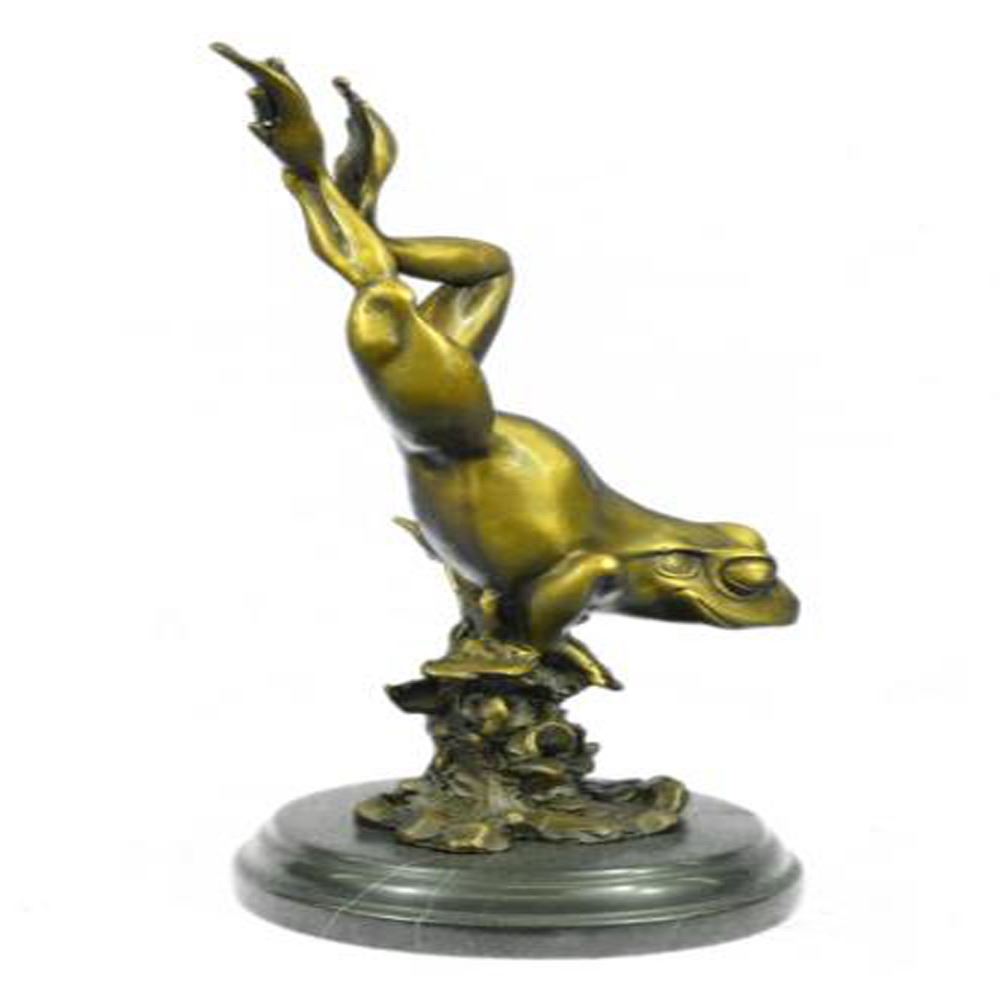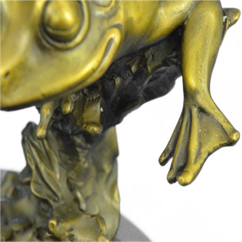 The Bronze frog is a secretive species, hiding under vegetation near ponds, creeks and rivers. It may be difficult to find until warm, humid evenings when its mating call is heard. Their diet includes small frogs. It reaches sexual maturity in the first full summer after metamorphosis. Breeding season begins in early spring and lasts through the summer. This Sculpture was cast using the Lost Wax Method and is gold patina with hints of gold highlights and is mounted on a marble base. Bronze Dimensions with Marble Base: Height 13 X Width 11 inches. Weight: 8 LBS.