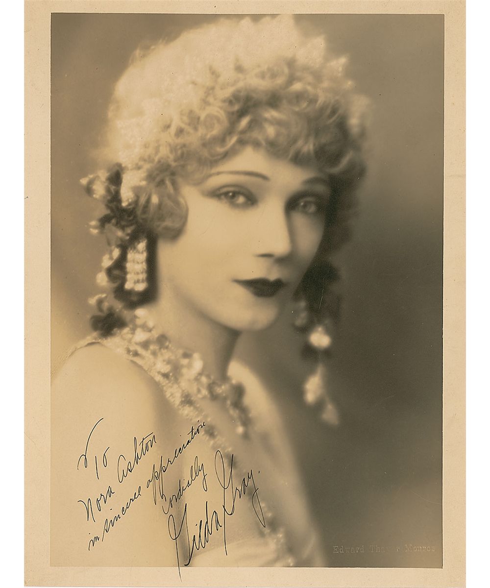 Polish-born American actress and dancer (1901–1959) who first came to prominence when she popularized the dance move called the ‘Shimmy.’ Vintage matte-finish 9.75 x 12.5 Edward Monroe photo of the actress adorned in jewelry, signed and inscribed in fountain pen, “To Nora Ashton, in sincere appreciation, Gilda Gray.” In fine condition, with a few scattered light surface creases.