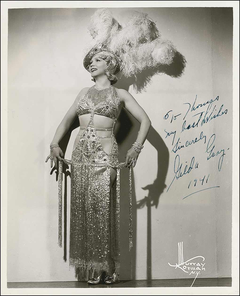 Vintage glossy 8 x 10 photo of Gray in an elaborate (and revealing for the time) costume, signed and inscribed in fountain pen “To Thomas, My best wishes, Sincerely, Gilda Gray 1941.” In fine condition.