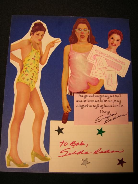 Gilda Radner signed card, which is attached to a blue board bearing a number of cut-out images of Radner in the guise of some of her classic comedy characters. One of these is Roseanne Rosannadanna, famous on Saturday Night Live. The slip of white paper featuring Radner's signature is adorned with star stickers. (8x10)