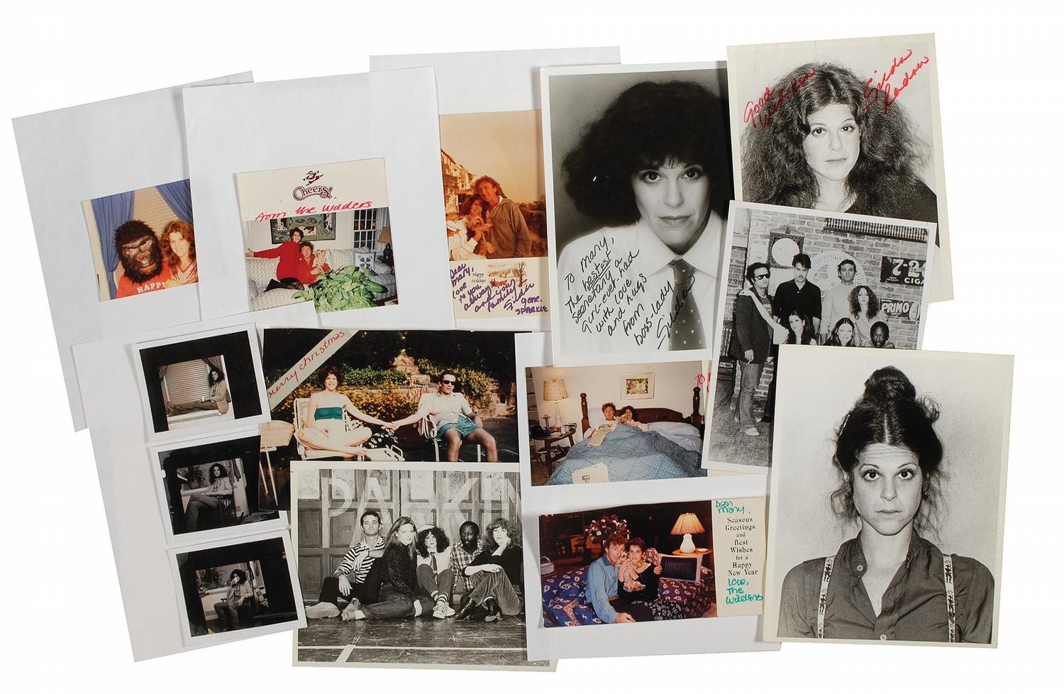 A collection of fourteen items, six of which are signed: a glossy 8 x 10 photo, signed and inscribed in black felt tip, “To Mary, the bestest secretary a girl ever had, with love and hugs from boss-lady Gilda”; a glossy 7 x 9 photo signed and inscribed in red felt tip, “Good Luck Ken, Gilda Radner”; and four different photo Christmas cards of Radner and her husband Gene Wilder, all filled out by Radner, two signed “The Wilders,” one signed “Gilda,” and the last one unsigned. Also included are eight unsigned photos, including two with her Saturday Night Live cast mates and a candid photo of Radner and a man in a gorilla mask. In very good condition, with creasing and surface impressions to the two glossy photos. A unique and private collection—originating from Gilda’s personal secretary—commemorating this talented comedienne.