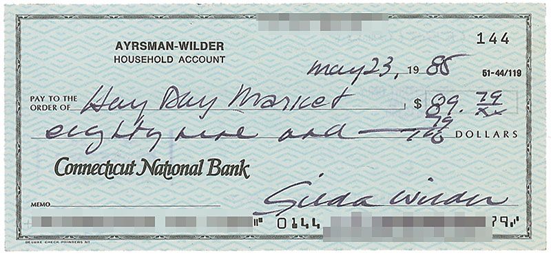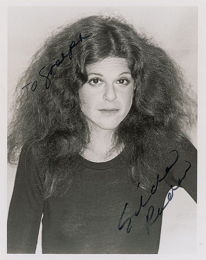Two items: glossy 7 x 9 photo, signed and inscribed in black felt tip, “To Joseph, Gilda Radner”; and a Ayrsman-Wilder Household Account check, 6 x 2.75, filled out and signed by Radner, payable to Hay Day Market for $89.79, May 23, 1985. In fine condition.