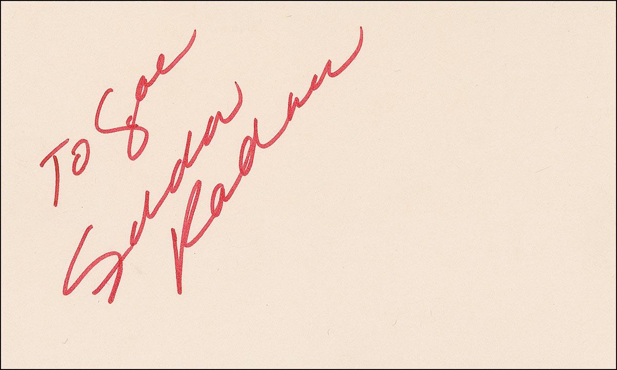 Superb in-person red felt tip signature and inscription, “To Joe, Gilda Radner,” on an off-white 5 x 3 card. In very fine condition.