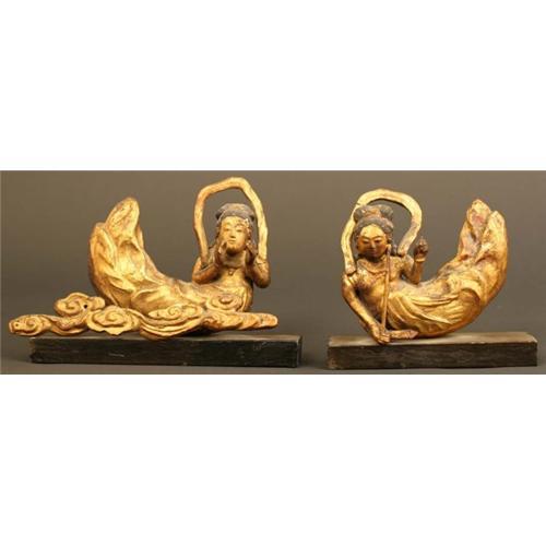 Pair of Exquisite Gilded 18th Century Japanese Angels Wood Sculpture. One angel has her scarf unfurled and caught in a tree. The other is up in the clouds in heaven. Legend has it the angel?s scarf is caught in a tree and did not allow her to heaven. A young man passing heard her and fell in love with her, but was distraught at her sadness and released her scarf so that she could fly back to heaven. Angel with scarf: 5 inches (13cm) long, Angel on clouds: 6 3/4 inches (17cm) long, height of both angels is 4.5 inches. Fine Condition. From a prominent and widely exhibited collection.