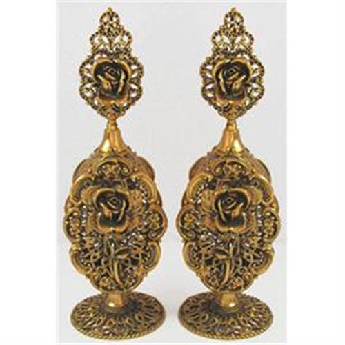 </font></strong>This pair of ornate gilded brass or ormolu perfume bottles were produced circa 1930s and they each measures 9 1/2 inches tall. Featuring an intricate floral and geometric pattern that runs throughout the bottles, their feet and their stoppers - both bottles and stoppers are further adorned with roses front and back. The stoppers are complete with dauber that fits into a screw in brass and glass canisters where the perfume once was and still can be held. Both bottles and stoppers,including daubers and cannisters, are in excellent condition</font>