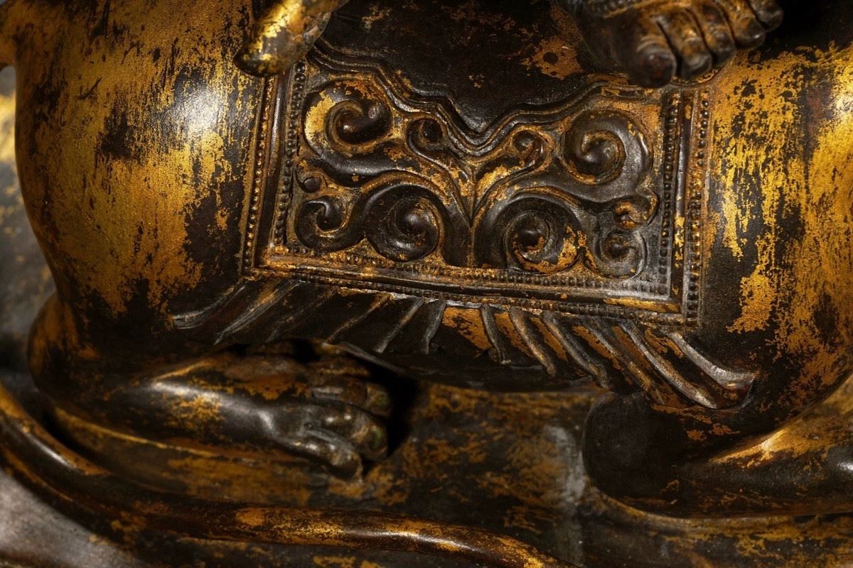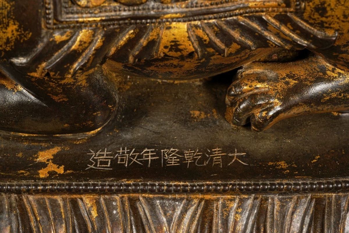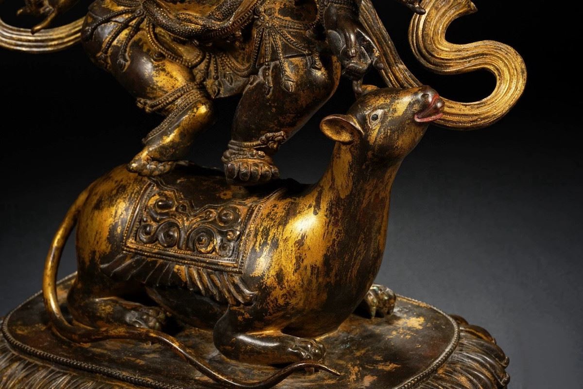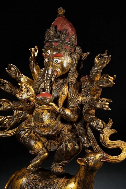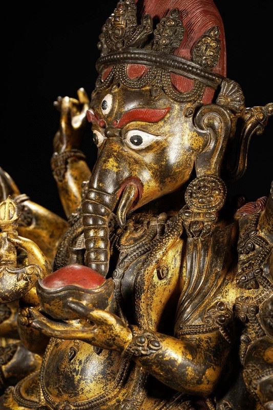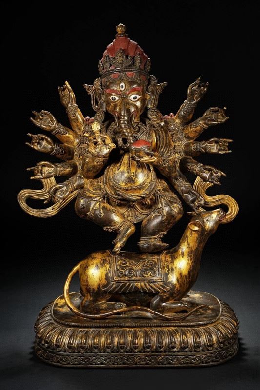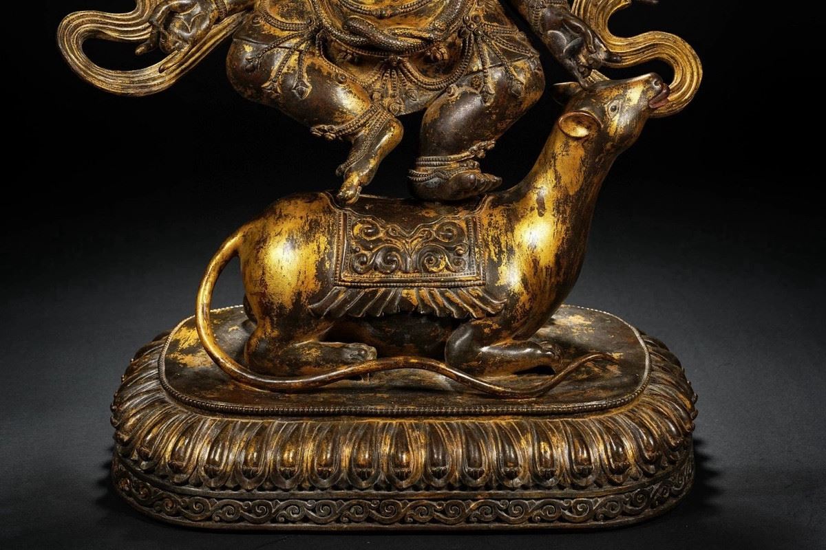 This exquisite gilded bronze statue of the elephant-headed god, crafted during the Qianlong period of the Qing Dynasty, demonstrates exceptional craftsmanship. The figure of the elephant-headed god represents wealth, wisdom, and the removal of obstacles. The intricate details, gilded in gold, and the divine posture reflect the opulence and skill of the Qing court artisans. The standing posture of the god symbolizes authority and protection, showcasing the cultural and religious beliefs of the Qianlong era.