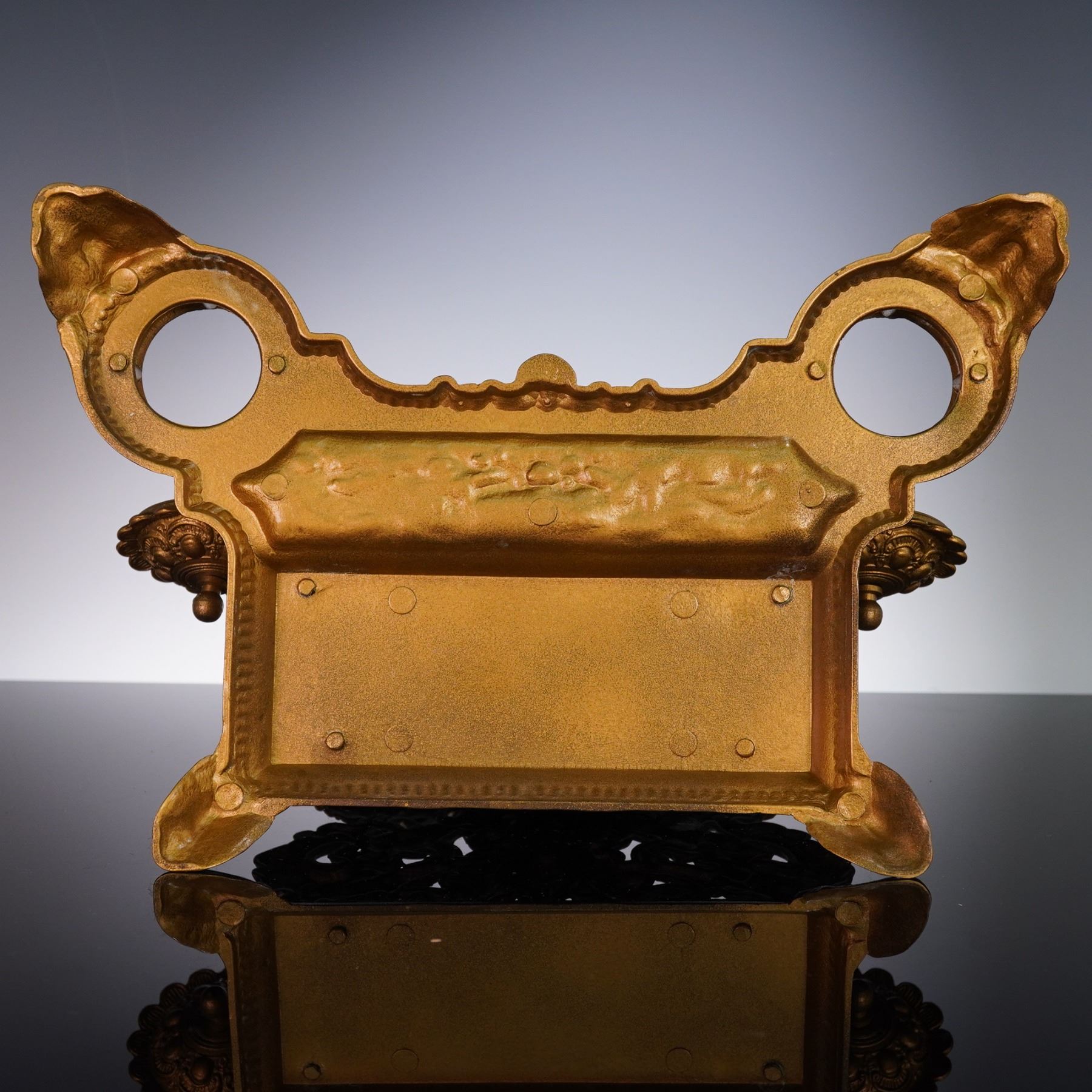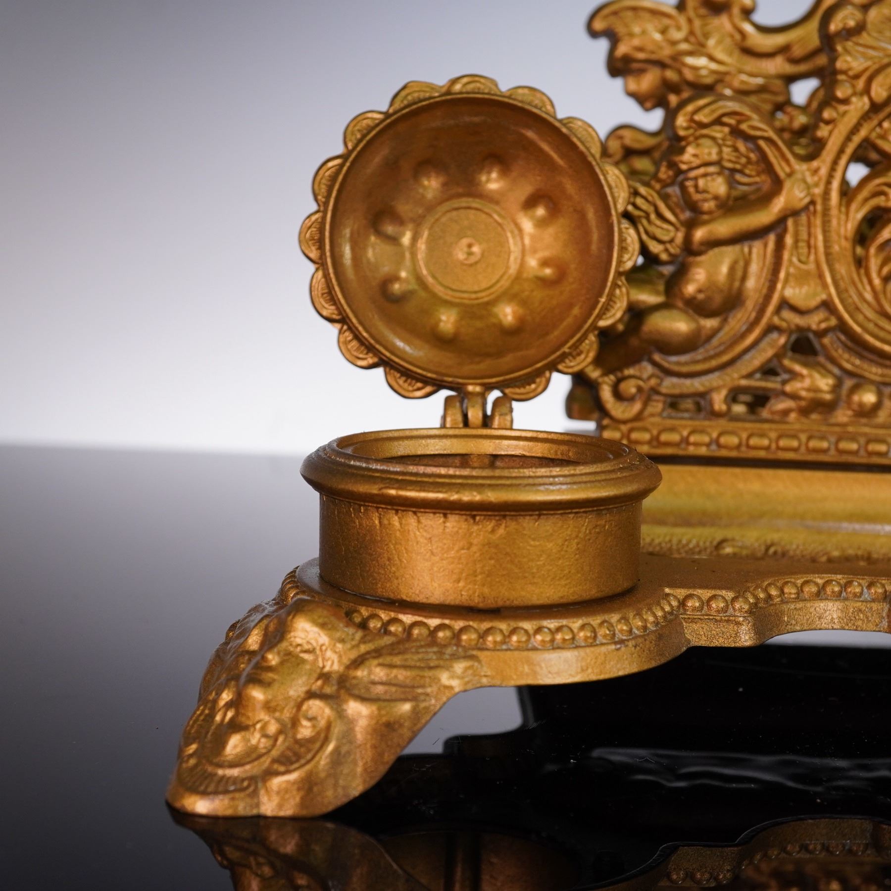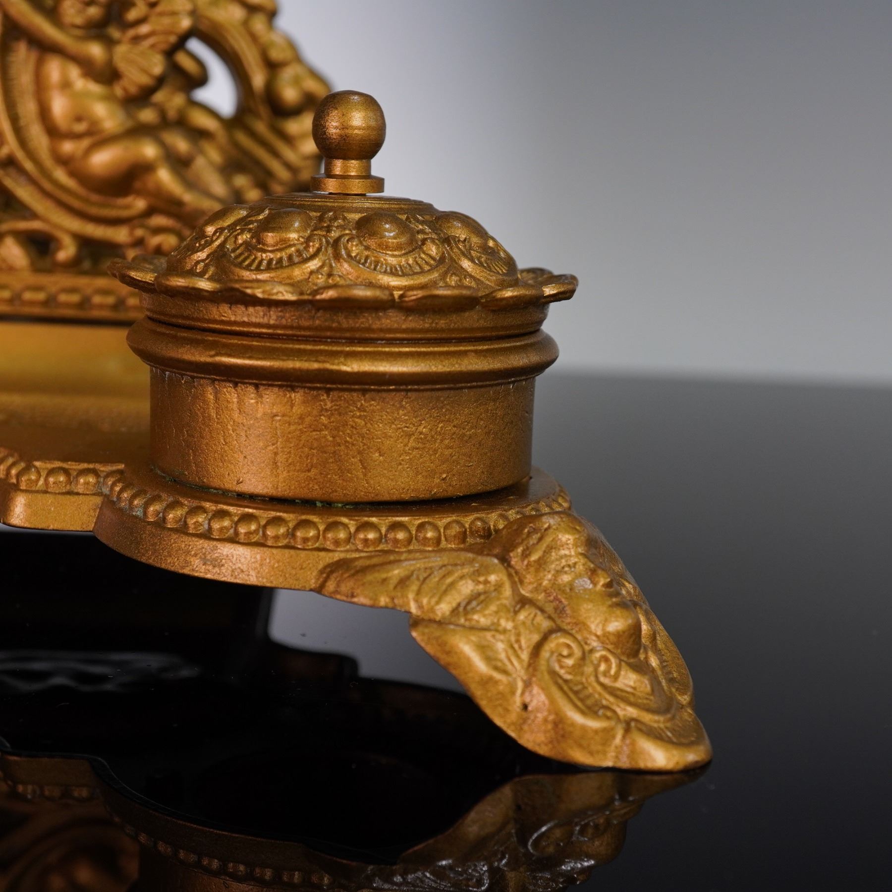 This exceptional double inkwell is crafted from cast iron with an elegant gilded finish, showcasing the opulence and craftsmanship of the 20th century. The set features two lidded inkwells flanking a central writing space, all mounted on a robust base with decorative relief and figural embellishments. Each inkwell has a domed, hinged lid with a rosette motif, and they are housed within raised cylindrical wells that exhibit intricate detailing along their borders. The highlight of this piece is its richly ornamented backplate, which presents an elaborate high-relief design featuring a central cherub flanked by mythological figures and scrolling acanthus leaves. The composition is symmetrical and displays fine artistic flourish, lending an air of classical grandeur. The rear view reveals a smooth, finished back with round openings, suggesting it may also have been mounted or fitted within a larger writing apparatus or furniture piece. A magnificent and functional addition to any collector's desk or period decor, this double inkwell captures the romance and refinement of an earlier age. Ideal for collectors of writing instruments, Victorian desk accessories, or decorative metalwork.