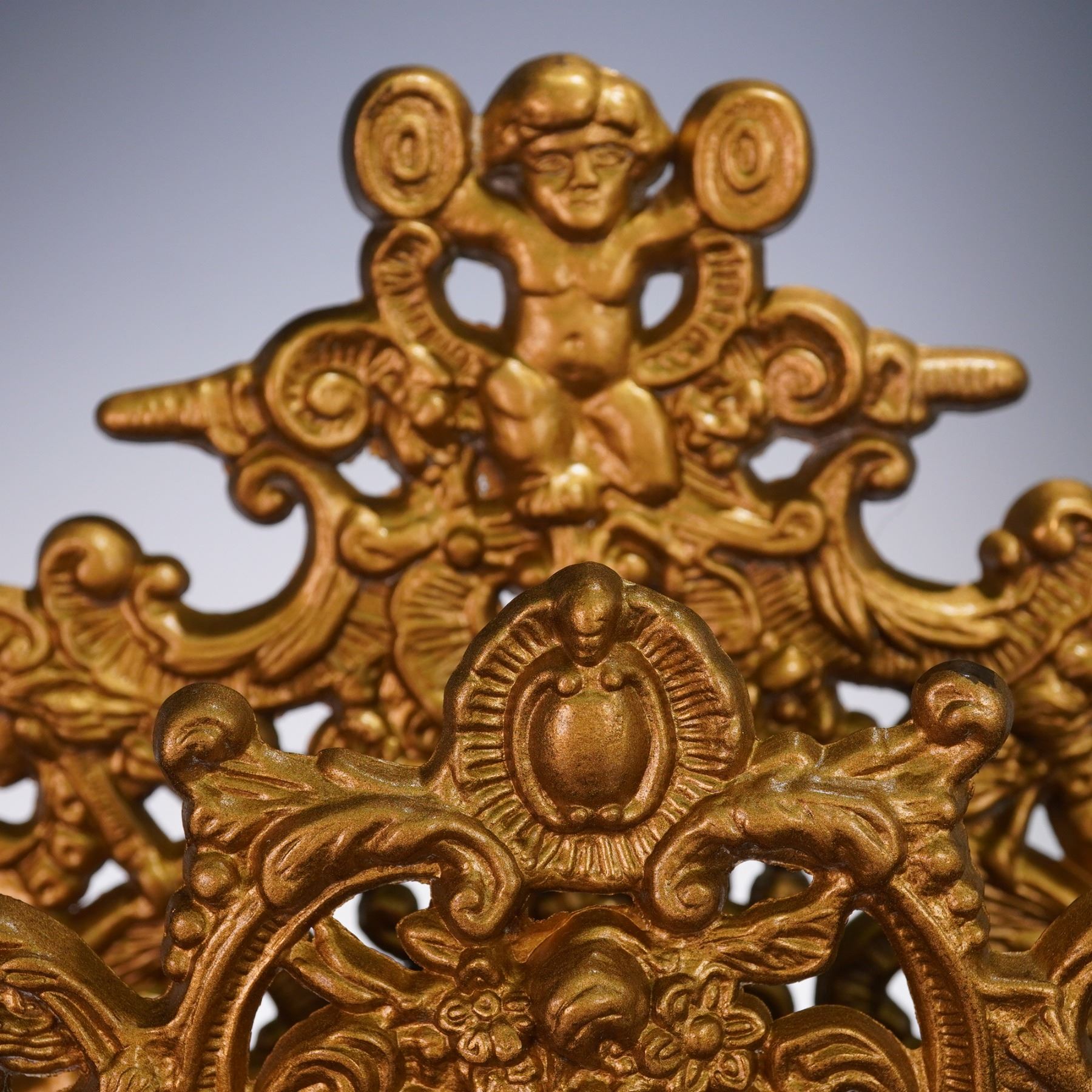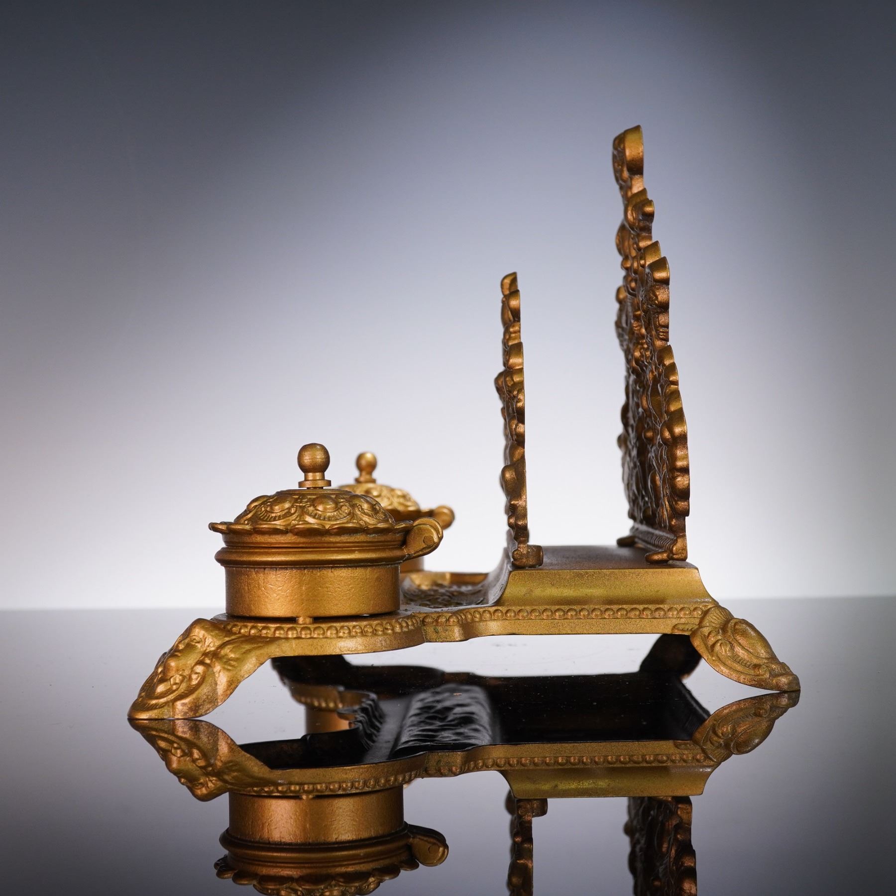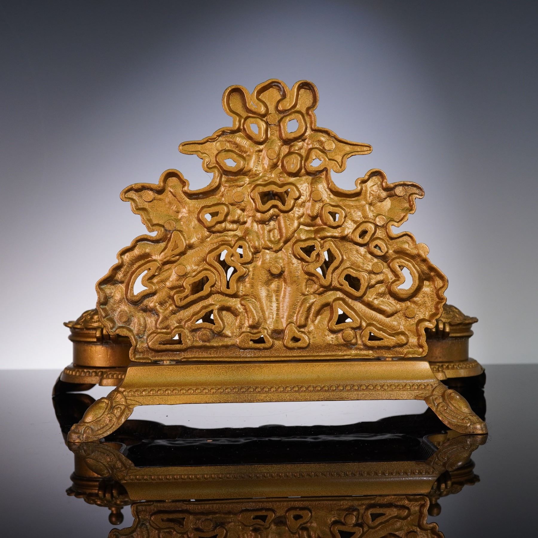 This exceptional double inkwell is crafted from cast iron with an elegant gilded finish, showcasing the opulence and craftsmanship of the 20th century. The set features two lidded inkwells flanking a central writing space, all mounted on a robust base with decorative relief and figural embellishments. Each inkwell has a domed, hinged lid with a rosette motif, and they are housed within raised cylindrical wells that exhibit intricate detailing along their borders. The highlight of this piece is its richly ornamented backplate, which presents an elaborate high-relief design featuring a central cherub flanked by mythological figures and scrolling acanthus leaves. The composition is symmetrical and displays fine artistic flourish, lending an air of classical grandeur. The rear view reveals a smooth, finished back with round openings, suggesting it may also have been mounted or fitted within a larger writing apparatus or furniture piece. A magnificent and functional addition to any collector's desk or period decor, this double inkwell captures the romance and refinement of an earlier age. Ideal for collectors of writing instruments, Victorian desk accessories, or decorative metalwork.